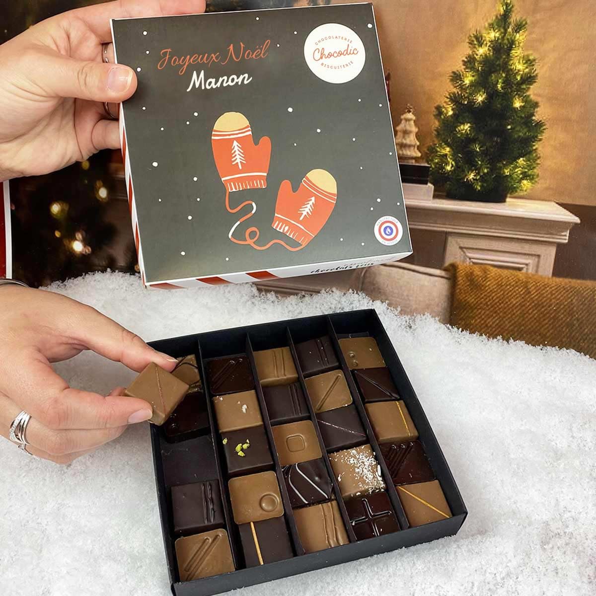 Offer these pretty boxes containing our fine chocolates presented flat (to be discovered on our flavor menu). Our fine chocolates are handcrafted in our workshop by our master chocolatiers. Your box will be filled with chocolates coated in 73 cocoa dark chocolate, milk chocolate, and white chocolate – Assortment of praline chocolates and ganaches.Format 36 chocolates - 18.1x18.1x2.6cm - 290g. Format 25 chocolates - 15x15x2.3cm - 200g. All of our products are made within our 100 artisanal family business (without colorings or preservatives), in an eco-responsible approach through our cocoa producers who are part of a sustainable cultivation action. To personalize your box, nothing could be simpler 1 enter your text - 2 validate your creation. Personalization of the box with your text. Your box will be filled with chocolates coated in 73 cocoa dark chocolate, milk chocolate and white chocolate - Assortment of praline chocolates and ganaches. Offrez ces jolies boites contenants nos chocolats fins présentés à plat (à découvrir sur notre carte des saveurs). Nos chocolats fins sont fabriqués de façon artisanale dans notre atelier par nos maîtres chocolatiers. Votre boite sera garnie de chocolats enrobés de chocolat noir 73 de cacao, de chocolat au lait et de chocolat blanc – Assortiment de chocolats pralinés et de ganaches.Format 36 chocolats - 18,1x18,1x2,6cm - 290g. Format 25 chocolats - 15x15x2,3cm - 200g. L'intégralité de nos produits sont fabriqués au sein de notre entreprise familiale 100 artisanale (sans colorants ni conservateurs), dans une démarche éco-responsable au travers de nos producteurs de cacao qui s'inscrivent dans une action de culture durable. Pour personnaliser votre coffret rien de plus simple 1 saisissez votre texte - 2 validez votre création. Personnalisation du coffret avec votre texte. Votre boite sera garnie de chocolats enrobés de chocolat noir 73 de cacao, de chocolat au lait et de chocolat blanc – Assortiment de chocolats pralinés et de ganaches.