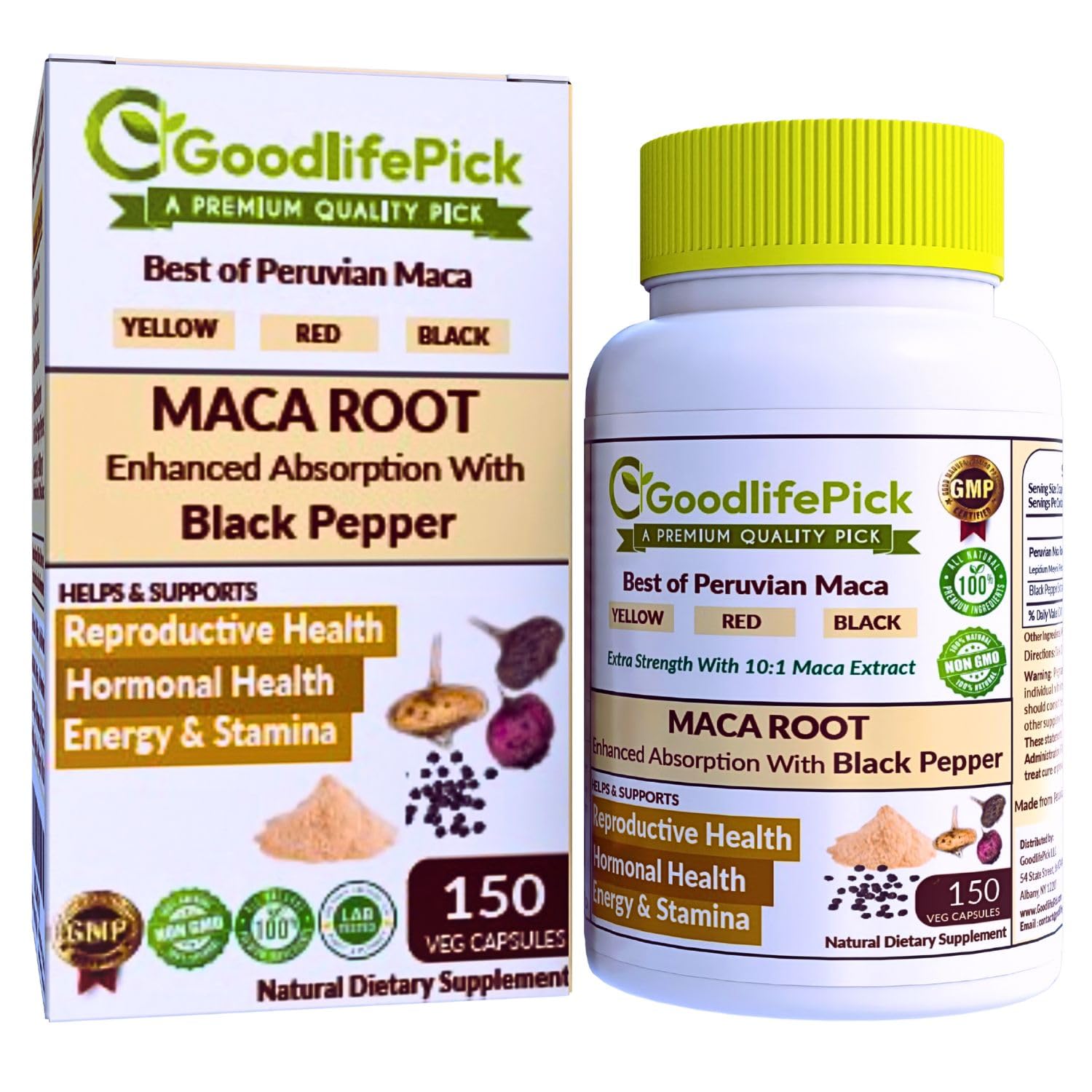 PURE SAFE LAB-TESTED GoodLifePick Maca Root Supplements Maca Powder Capsules are All Natural, 100 Vegan, Non-GMO, NO ADDITIVES, NO USE OF RICE POWDER, NO MAGNESIUM STEARATE, NO FILLERS, NO GLUTEN, NO BINDER, NO SOY, NO DAIRY, NO CORN. EXTRACTED FROM SINGLE SOURCED PREMIUM MACA ROOT POWDER : Sourced exclusively from the high-altitude regions of the Peruvian Andes to deliver the purest, most potent form of this ancient superfood. Grown in its native, nutrient-rich soil, our single-sourced Maca ensures maximum effectiveness. ENHANCED ABSORPTION SUPERIOR BENEFITS WITH 95 STANDARDIZED PIPERINE(BLACK PEPPER EXTRACT) : Experience the transformative power of Maca Root our Maca Root Capsules, you're not just getting Maca Root you're getting a powerful formula that Maximizes its Potential Benefits with Enhanced Absorption through our 95 standardized Piperine to elevate your well-being. SUPERIOR POTENCY (10:1 Powerful Extract Blend of Maca Root blend that includes Yellow Maca, Black Maca Red Maca. Experience the extraordinary power of Maca Root like never before with GoodlifePick's Maca Root Capsules. Our Advance formula packs a punch with a Superior Potency and uses the blend of All 3 types of Maca Roots i.e. Yellow Maca Root, Black Maca Root, and Red Maca Root Powder.