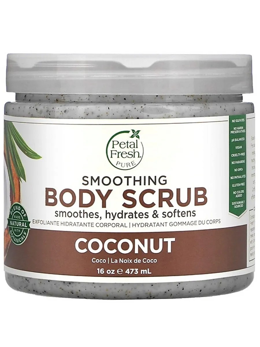PETAL FRESH Skin-Smoothing Body Scrub with Coconut Extract, 473 ml. Exfoliate and moisturize your skin with the Petal Fresh Body Scrub with Coconut Extract. This regenerating scrub gently exfoliates, revealing a natural, healthy glow. Certified organic coconut oil and other beneficial ingredients leave your skin feeling silky smooth. Key Ingredients: Coconut oil is known for its beneficial properties, including antibacterial, antifungal, and moisturizing properties. Free from preservatives, parabens, and GMOs. Vegan and cruelty-free. Directions: Apply an appropriate amount and massage in circular motions to increase circulation, then rinse. For all skin types.