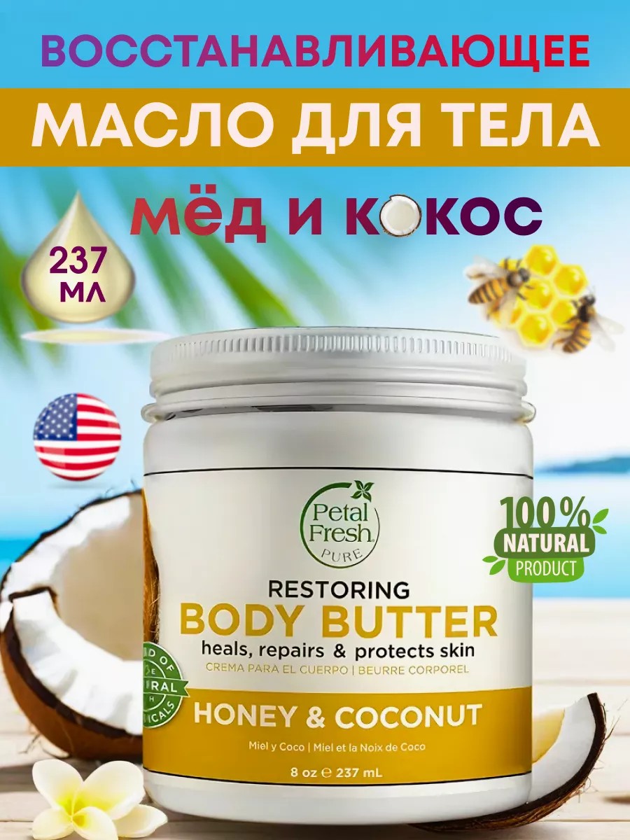 Восстанавливайте свою кожу с помощью регенирующего масла для тела Petal Fresh с экстрактом меда и кокоса в баночке 237 мл. Кокос является отличным натуральным отшелушивающим средством, а также повышает уровень липидов на поверхности эпидермиса, придавая невероятную мягкость. Питательная гипоаллергенная формула обогащена экзотической смесью сертифицированного органического арганового масла и экстракта масла ши (карите) и антиоксидантов, которые позволяют вашей коже стать шелковистой и гладкой, освежить и подтянуть ее, а также оставит фантастический долгий аромат. Мед и масло чайного дерева помогают в лечении угревой сыпи, уходе за проблемной жирной кожей – нормализует выработку кожного сала и борется с бактериями . Просто нанесите необходимое количество на чистое тело , руки, локти, ноги и пятки и наслаждайтесь спа процедурой, не выходя из дома. Парфюмированный софт баттер с кремовой густой текстурой быстро впитывается, не оставляя пленки, и обеспечивает длительное увлажнение до следующего мытья. Избавляет от шелушений, чувства стянутости и обезвоженности. Эффективен и в летнее время для восстановления от воздействия солнечных лучей, так и в холодное зимнее, при морозе и ветре, которые могут вызвать трещины и покраснения. Попробуйте это настоящее SOS средство и почувствуйте разницу уже с первого применения. Экономичный расход, действует как насыщенный лосьон, c омолаживающим и антивозрастным эффектом. Универсальный запах женский и мужской одновременно, унисекс не оставит никого равнодушным и подойдет для всей семьи. Благодаря стильному дизайну будет отлично смотрется в интерьере вашей ванной комнаты и подойдет в качестве новогоднего подарка жене, сестре или дочери. Входящие в состав гамма-линолевые кислоты обуславливают заживляющий эффект, поэтому его используют при раздражениях, покраснениях, дерматитах и аллергических высыпаниях. Разглаживает, убирает мелкие морщинки, восстанавливает верхние кожные слои после агрессивных химических и механических пилингов.