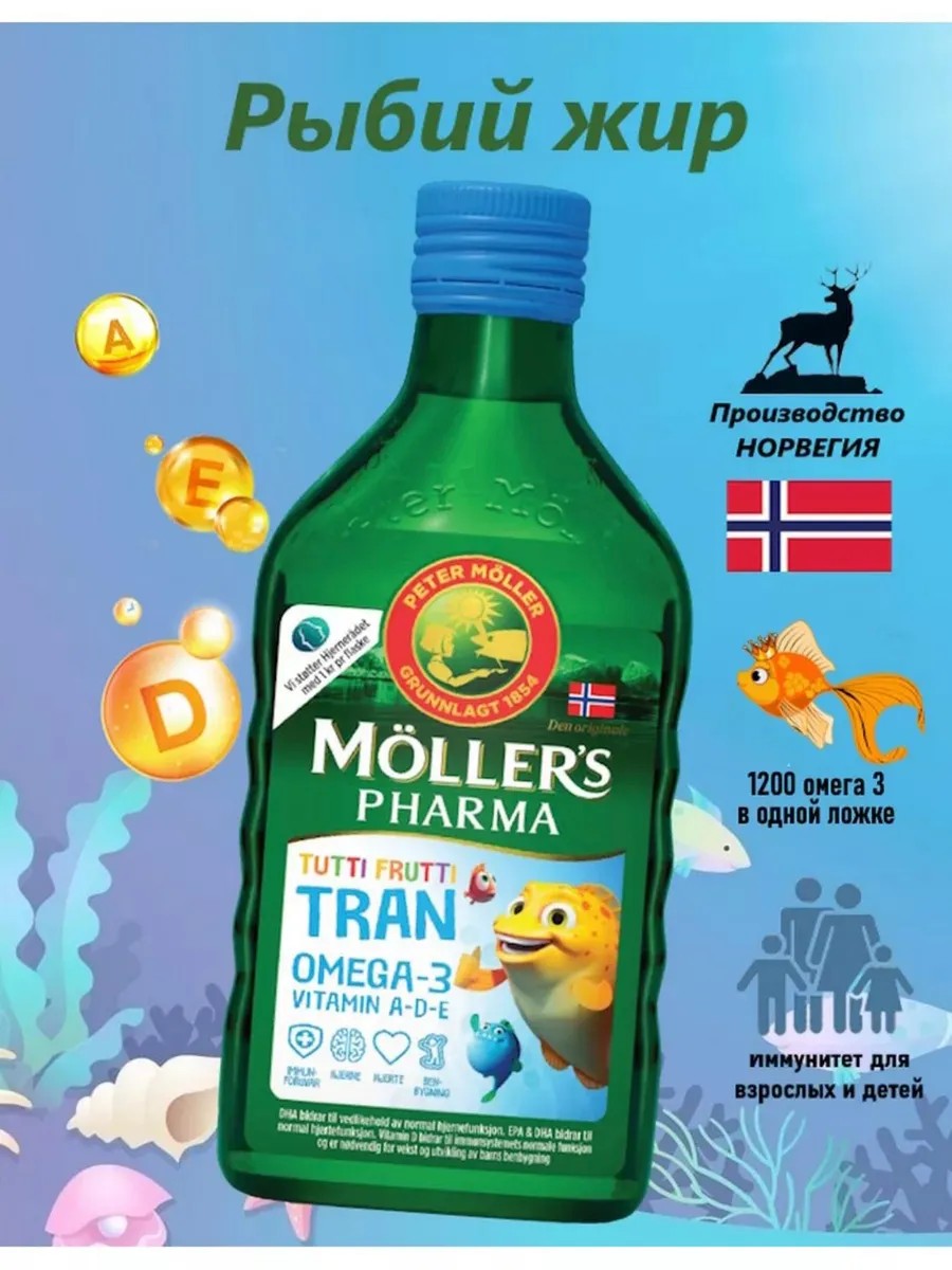 Натуральный рыбий жир Möller's Pharma жидкий со вкусом Tutti Frutti — источник омега-3 из дикой трески