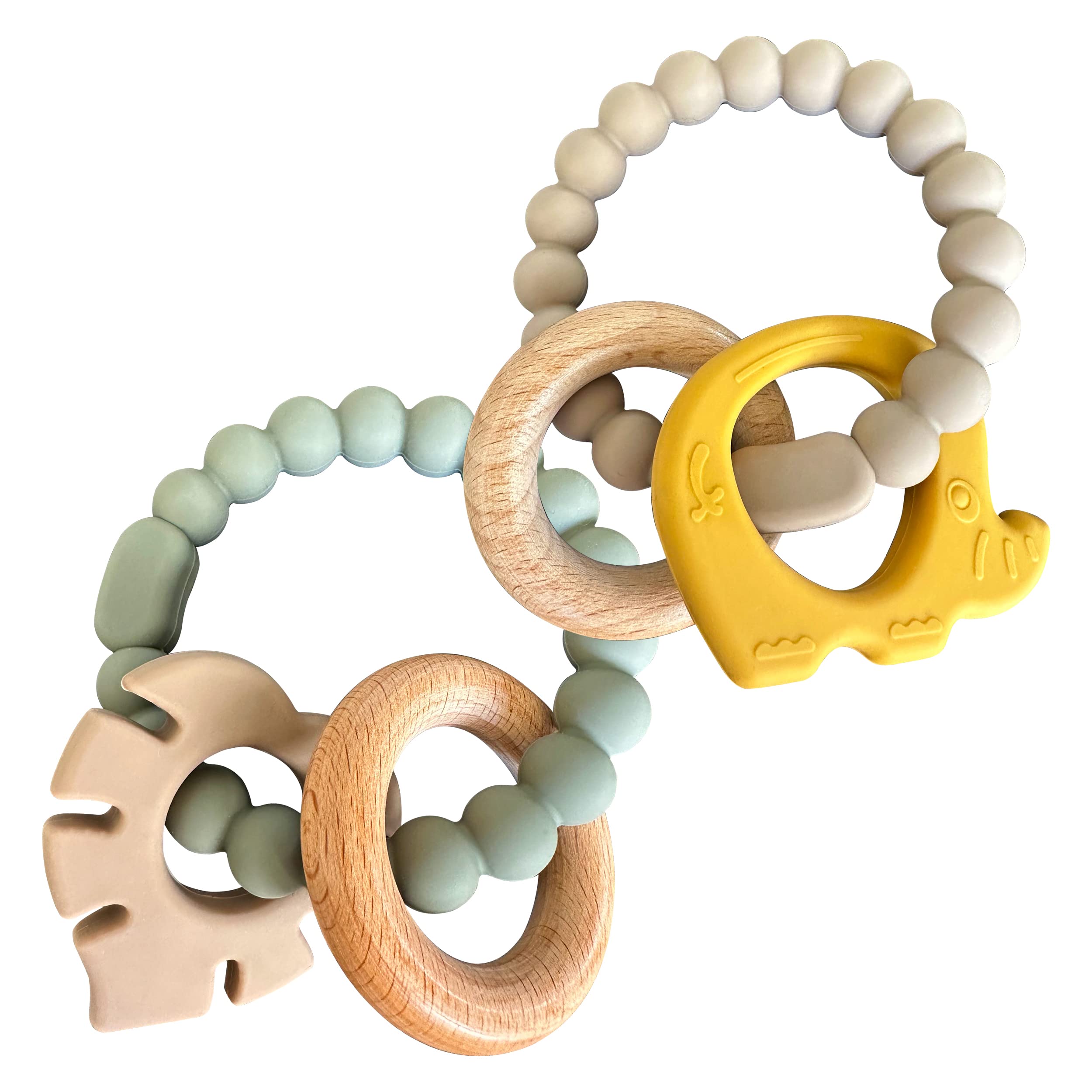 Petite Bee - Silicone & Wood Baby Teether Elephant & Leaf Ring Soothing Pacifier & Infant Chew Toy (2 Pack)