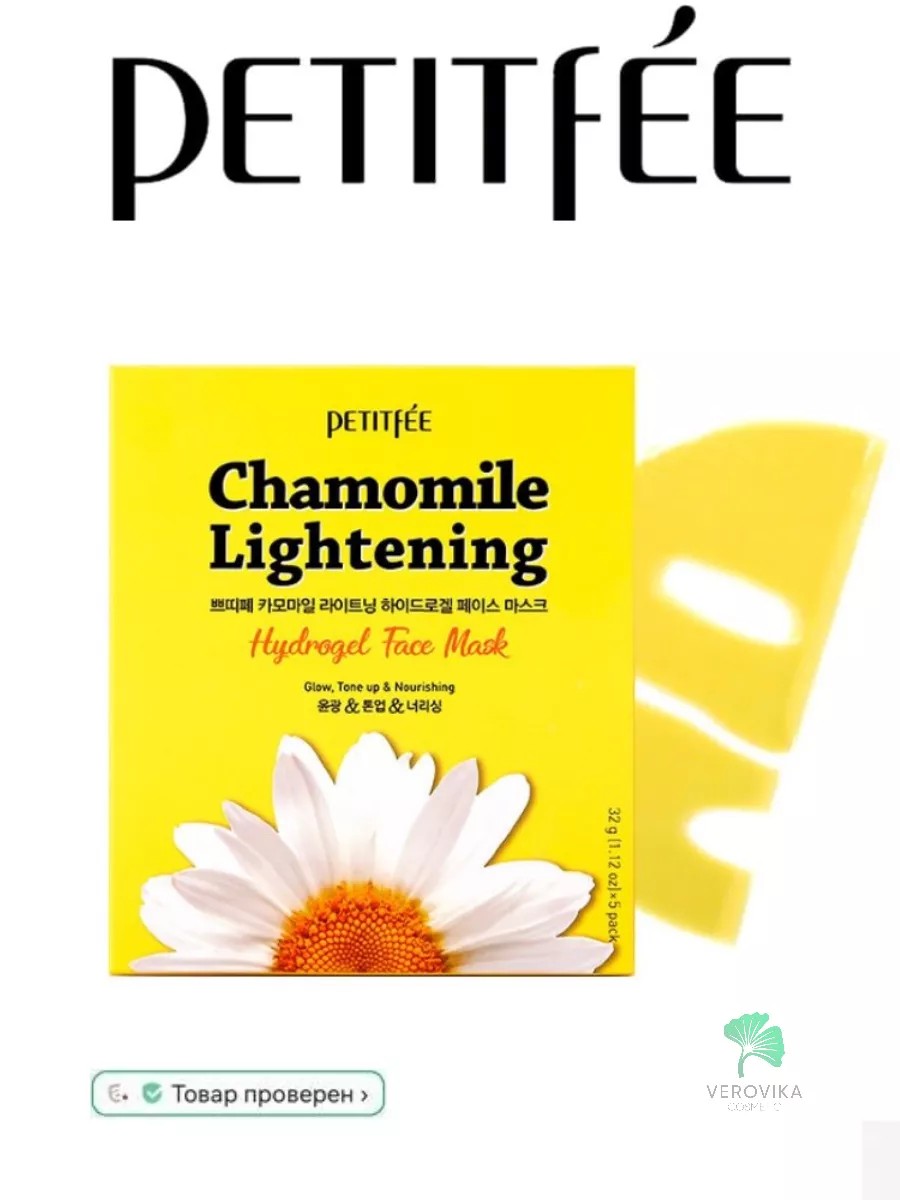 Гидрогелевая маска экстрактом ромашки Chamomile Lightening Hydrogel Face Mask от Petitfee содержит Water, Glycerin, Calcium Chloride, Methylpropanediol, Ceratonia Siliqua (Carob) Gum, Xanthan Gum, Ethyl Hexanediol, PEG-60 Hydrogenated Castor Oil, Chondrus Crispus Powder, Phenoxyethanol, Scutellaria Baicalensis Root Extract, Camellia Sinensis Leaf Extract, Houttuynia Cordata Extract, Artemisia Princeps Leaf Extract, 1,2-Hexanediol, Caprylyl Glycol, Chlorphenesin, Hippophae Rhamnoides Oil, Butyrospermum Parkii (Shea) Butter, Hydroxyethylcellulose, Citrus Junos Fruit Extract, Tagetes Erecta Flower Extract, Lavandula Angustifolia (Lavender) Extract, Monarda Didyma Leaf Extract, Mentha Piperita (Peppermint) Leaf Extract, Freesia Refracta Extract, Chamomilla Recutita (Matricaria) Flower Extract, Rosmarinus Officinalis (Rosemary) Leaf Extract, Cucurbita Pepo (Pumpkin) Fruit Extract, Ethylhexylglycerin, Disodium EDTA, Malt Extract, Fragrance.