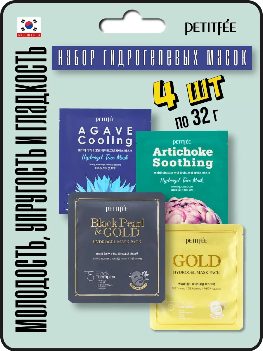 A set of rejuvenating hydrogel masks for facial skin care. This Korean face mask set includes 4 hydrogel masks. They fill the skin with elasticity, add radiance, and have a smoothing, lifting, and restorative effect. 1) PETITFEE Black Pearl & Gold Hydrogel Mask Pack. This anti-aging Korean hydrogel face mask provides deep hydration and forms a protective barrier. Black pearl extract gives the skin radiance, colloidal gold tones, beta-glucan restores damaged areas of the epidermis, and peat extract moisturizes and nourishes the skin. Avocado oil and extracts of green tea, lemon, and scutellaria algae provide hydration and protection from external influences, soothe irritation and redness. 2) PETITFEE Gold Hydrogel Mask Pack. This gold rejuvenating hydrogel mask will give the face a smooth and healthy glow. Gold in the form of 24-karat colloidal gold is a source of beneficial substances for skin beauty. It promotes rejuvenation, accelerates metabolic processes in the epidermis, improves skin elasticity, and helps smooth wrinkles. Adenosine and collagen have anti-aging properties, helping smooth wrinkles and fine lines. 3) Agave Cooling Hydrogel Face Mask. This cooling hydrogel mask with agave extract will provide skin relaxation and help eliminate dullness and signs of fatigue. Contains agave, blueberry, and eggplant extracts, caffeine, and spirulina. 4) Artichoke Soothing Hydrogel Face Mask. A refreshing mask with artichoke and aloe, cabbage, and wormwood. Artichoke extract is a powerful antioxidant that helps neutralize the effects of photoaging. The mask intensively moisturizes the skin, relieves dryness, and soothes inflammation and irritation. A gift set of Korean face masks for a woman—a mother, a friend, or a girlfriend—for a birthday, New Year, or March 8th. Recommended for use in combination with the Petitfee line of Korean facial and body care cosmetics.