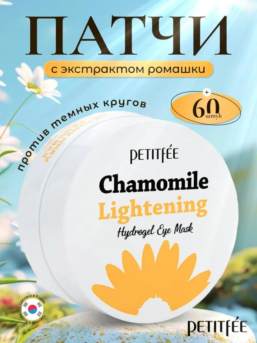 Гидрогелевые тонизирующие патчи для области вокруг глаз c экстрактом ромашки Chamomile Lightening Hydrogel Eye Mask от известного корейского бренда Petitfee осветляют темные круги, синяки под глазами, пигментацию и веснушки, тонизируют, успокаивают.