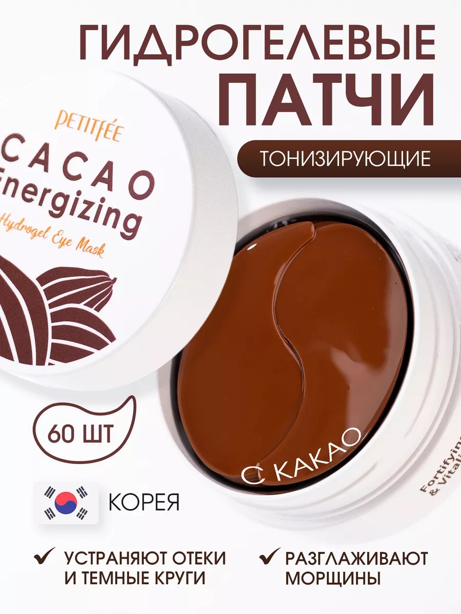 Тонизирующие гидрогелевые патчи с какао Petitfee Cacao Energizing Hydrogel Eye Patch быстро устраняют усталость и тонизируют кожу под глазами. Экстракт какао оказывает ярко выраженное лимфодренажное действие, помогает осветлить темные круги под глазами и мгновенно освежает взгляд. Они отлично увлажняют, помогают сохранять молодость кожи.