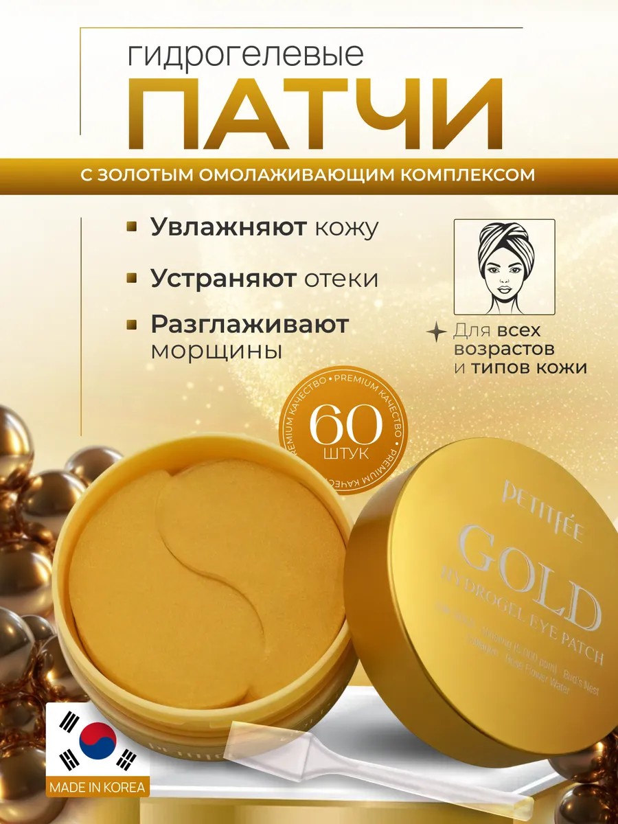 Petitfee Gold Hydrogel Eye Patch is a cosmetic product designed to restore, rejuvenate, smooth, and cool the skin around the eyes. It contains a complex of active ingredients: hyaluronic acid, collagen, vitamins, minerals, moisturizing and toning substances, as well as natural flower and plant extracts. The patches can be used not only around the eyes, but also on the nasolabial folds, chin, and forehead. They help smooth out expression lines, eliminate signs of fatigue and stress, and combat acne.