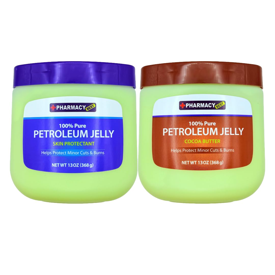 Keep your skin soft, smooth, and protected with this 2-Pack of Petroleum Jelly featuring one Original Formula and one Cocoa Butter Formula (13 oz each). Designed with 100 triple-purified white petrolatum, these skin-healing jellies form a protective barrier that locks in moisture and accelerates natural recovery. Perfect for cracked heels, rough elbows, chapped lips, and dry hands, this set ensures your skin gets the hydration it needs. The Original Jelly provides simple, fragrance-free healing that's gentle enough for sensitive skin, while the Cocoa Butter Jelly delivers the same soothing benefits with added nourishment and a subtle, comforting scent. Both are hypoallergenic, non-comedogenic, and safe for everyday use—even for those with eczema-prone skin or babies experiencing diaper rash. Beyond hydration, this versatile duo works as a first-aid ointment for minor cuts, scrapes, burns, and scars. It can also be used to heal tattoos, protect skin from chafing, soften eyebrows, and keep lips smooth and moisturized. Whether you're replenishing your bathroom cabinet or stocking up for family skincare, this dual-pack offers long-lasting value and multiple uses. Keep your skin healthy, protected, and glowing with this must-have Original Cocoa Butter set.MULTIPURPOSE BALM: Perfect for chapped lips, healing tattoos, soothing dry patches, softening rough spots, protecting against chafing, or even enhancing eyebrow definition. A must-have household staple for total skin care. SENSITIVE SKIN SAFE: Hypoallergenic, fragrance-free, and non-comedogenic—gentle enough for everyday use, including lip care, baby rashes, eczema-related dryness, or delicate areas of skin. CLINICALLY PROVEN HEALING: Works as a first-aid ointment for minor cuts, scrapes, burns, and scars while helping to accelerate recovery and reduce skin irritation. TRIPLE-PURIFIED PETROLEUM JELLY: Made with 100 white petrolatum, each formula creates a protective barrier that locks in moisture and supports the natural healing of cracked, rough, or severely dry skin. DUAL-PACK SKINCARE ESSENTIALS (13 OZ EACH): Includes one Original Petroleum Jelly and one Cocoa Butter Petroleum Jelly, giving you two powerful formulas to protect, soothe, and heal skin.
