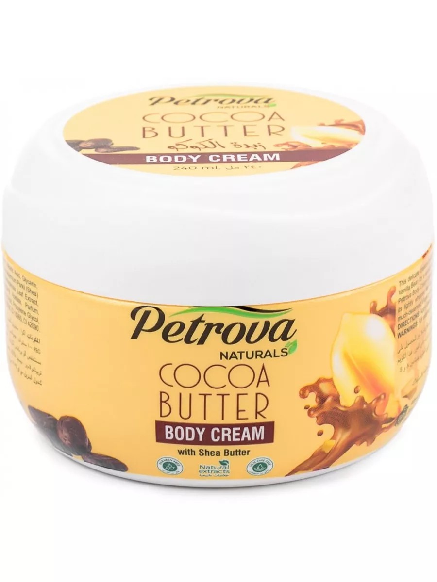 Petrova Chocolate Pleasure Body Cream - Cocoa & Vanilla with Shea Butter, Cocoa Butter, and Vanilla Extract, 240 ml. This creamy butter with shea butter, cocoa butter, vanilla, and aloe extract instantly moisturizes and nourishes your skin, enriching it with vitamins A and E, leaving it youthful and supple. Silicone- and paraben-free.