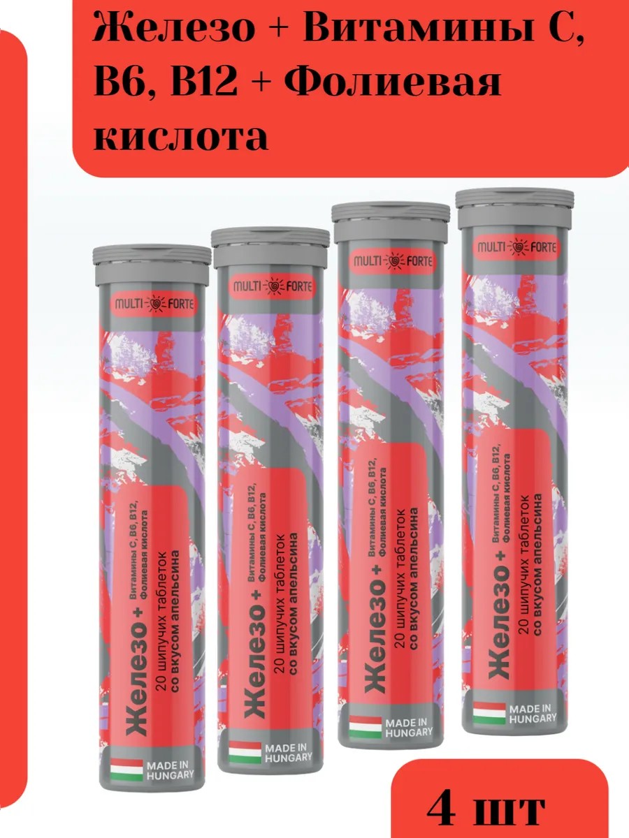 Железо и витамины C, B6, В12 и фолиевая кислота, комплекс витаминов от Биофорте в шипучих таблетках.