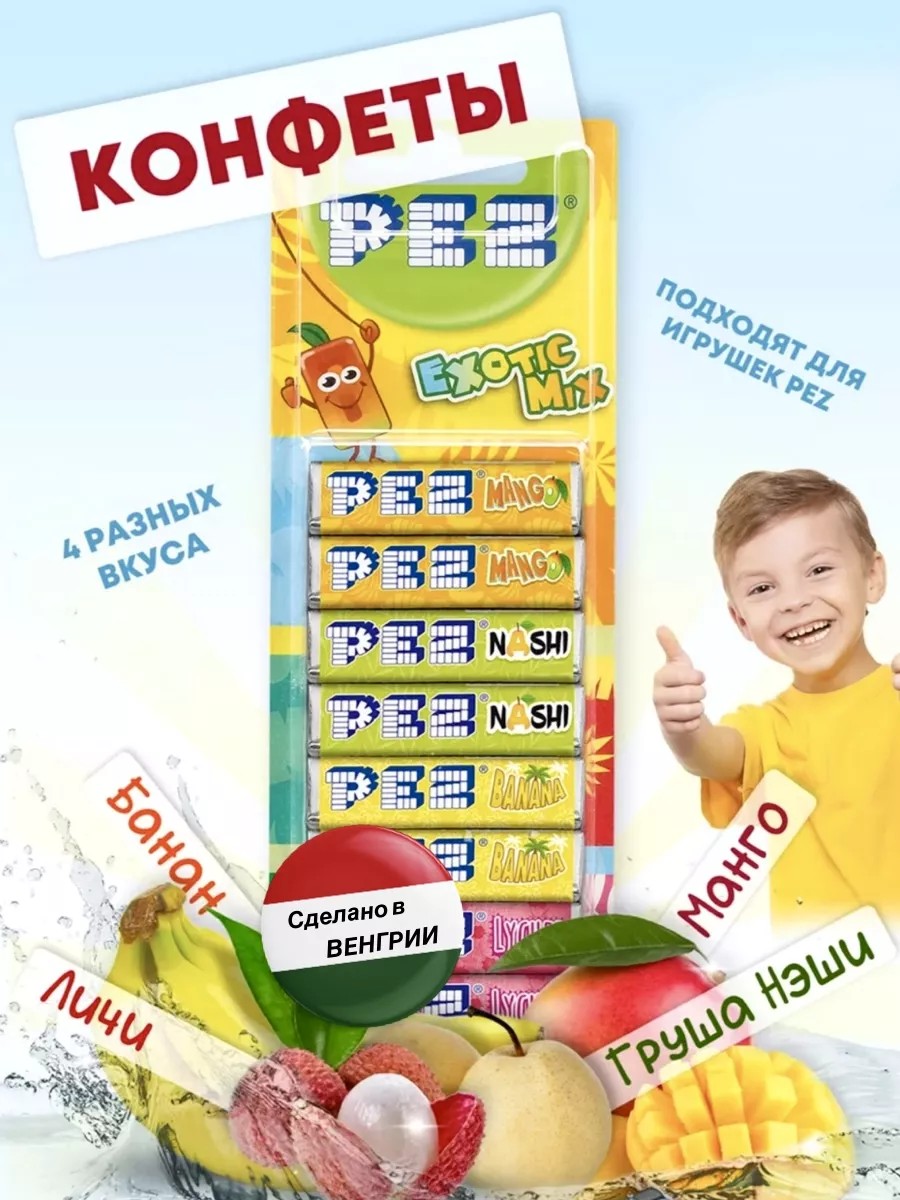 ПЕЦ конфета с фруктовым вкусом 8 штук в упаковке. PEZ является продуктом с уникальной комбинацией игрушки и конфет. Конфеты PEZ служат для наполнения игрушек-дозаторов PEZ, а также продаются отдельно в качестве детской сладости. Набор фруктовых конфет в упаковке состоит из 8 конфет-холодков с различными экзотическими вкусами: манго, наши, банан, личи.