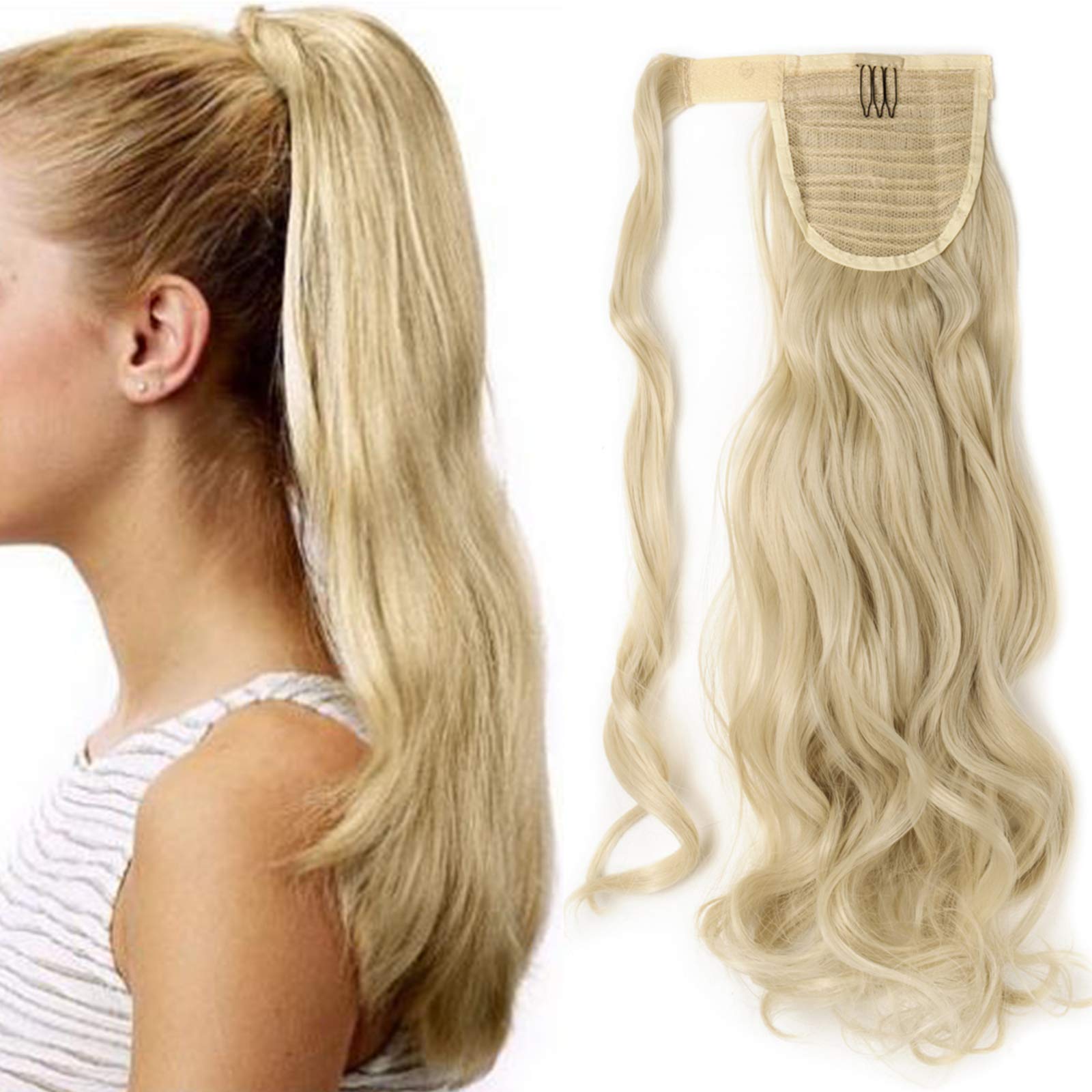 Pferdeschwanz Haarteil Zopf Clip in Ponytail Haarverlängerung Synthetik Haare Extension Hair Piece Wrap on für Frauen 43 cm Wavy-Gebleichtes Blond