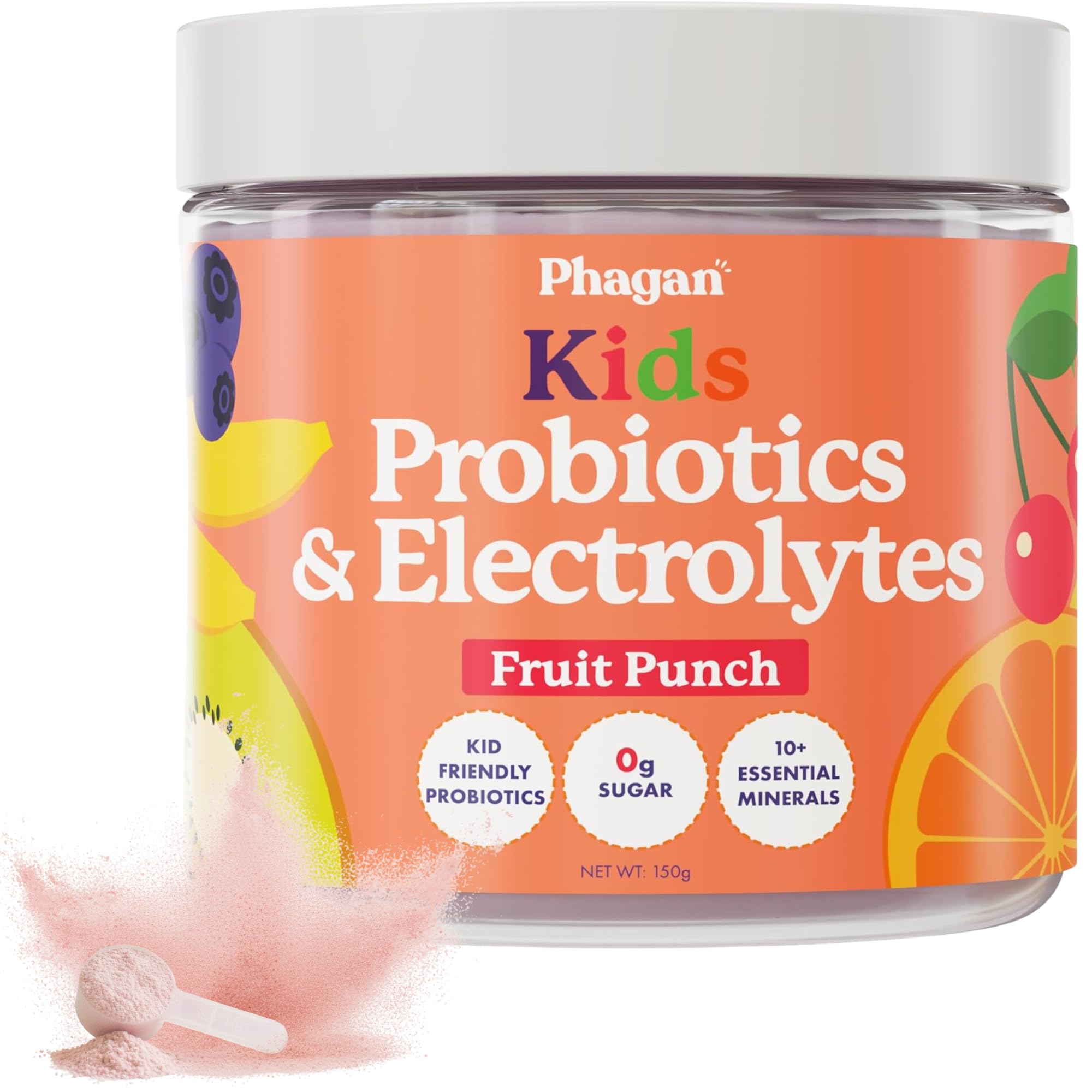 Phagan Kids Electrolyte + Probiotic Powder - Dual-Action Hydration & Immune Support with Zinc - Zero Sugar, Plant-Based Formula for Toddlers & Active Children - Fruit Punch, 30 Servings