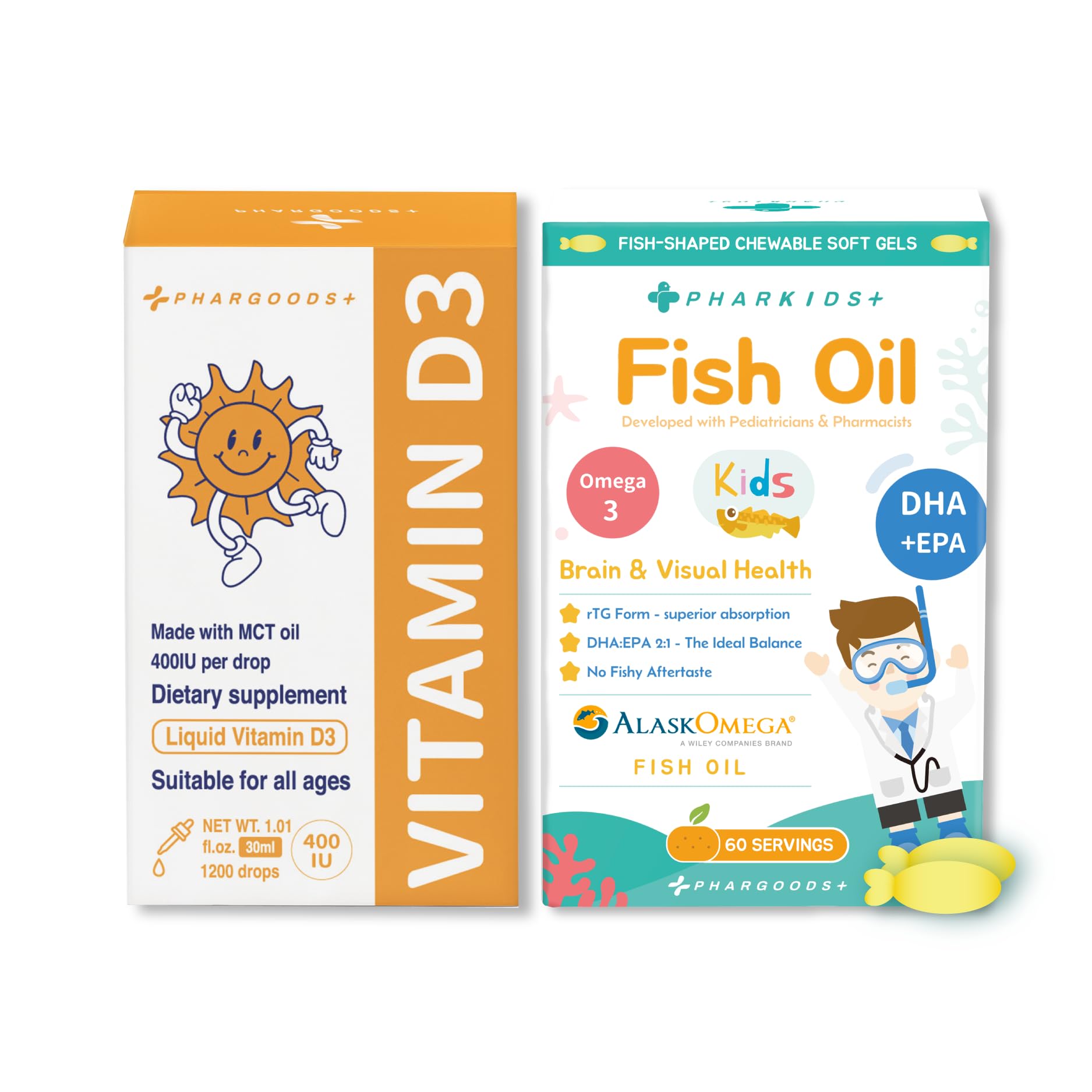 Give your child a strong start from the inside out with the Phargoods Kids' Essential Nutrition Duo — a pediatrician-developed bundle designed to support growing bodies and developing minds. This combines two of Phargoods' best-selling supplements: 1. Baby Vitamin D3 Drops (400 IU per drop, 1200 servings) Formulated to promote strong bones, healthy growth, and immune defense. Made with high-quality Swiss-sourced Quali-D, these drops are pure, gentle, and easy to take for newborns, infants, and kids. 2. Kids' Fish Oil (272mg Omega-3 per softgel, 60 servings) Crafted from 100 wild-caught Alaskan pollock, each fun orange-flavored softgel delivers a 2:1 DHA to EPA ratio to support brain, vision, and immune function. Free from artificial flavors, additives, and preservatives — with no fishy aftertaste. Together, this duo delivers comprehensive nutrition support for bone strength, brain development, and overall wellness — helping parents ensure their kids get the essential nutrients they need every day. Pure, safe, and backed by science — Phargoods helps families stay strong and healthy, one drop and one softgel at a time.Essential Nutrients, Simplified Routine Combines 1200 servings of Vitamin D3 and 60 servings of Fish Oil for complete daily nutrition that supports immune, bone, brain, and eye health. Easy, Tasty, and Fun Vitamin D3 drops are easy to give directly or mix into food, while orange-flavored fish-shaped softgels make healthy habits enjoyable. Pediatrician Developed, Parent Approved Formulated by pediatricians and pharmacists to meet the highest standards of child nutrition and wellness. Clean, Safe, and Trusted Ingredients Both products are free from artificial flavors, colors, sweeteners, and preservatives. Every batch is third-party tested for safety and quality. Complete Daily Support for Growing Kids A perfect combo for infants and children — Vitamin D3 for bone and immune strength Fish Oil for brain and vision development.