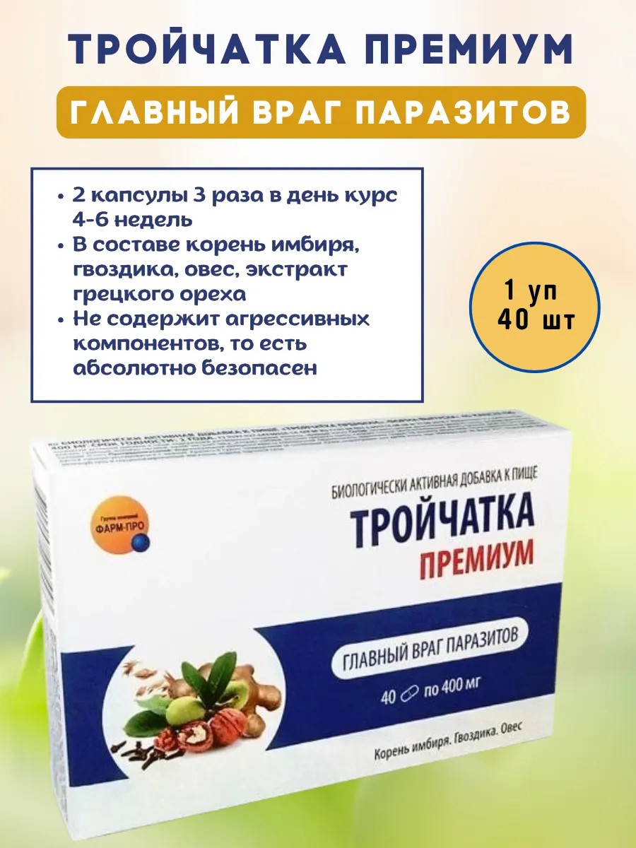 Тройчатка премиум - это биологически активная добавка (БАД) к пище - растительный комплекс, направленный на улучшение функций желудочно-кишечного тракта при паразитарной инвазии. При паразитарных инвазиях помимо медикаментозного лечения, уже традиционным стало применение комплекса трех растительных компонентов - гвоздики, корня имбиря и экстракта овса, называемых «тройчаткой». В препарате впервые противопаразитарное действие тройчатки дополнено свойствами экстрактом грецкого ореха. Все компоненты Тройчатки Премиум имеют традиции пищевого применения, то есть абсолютно безопасны. Не содержит агрессивных компонентов, присутствующих в составах аналогичных продуктов (цветков и экстракта пижмы). Капсулы просты в применении и могут использоваться как дополнение к основной терапии или в качестве профилактики. Упаковка содержит 40 капсул.