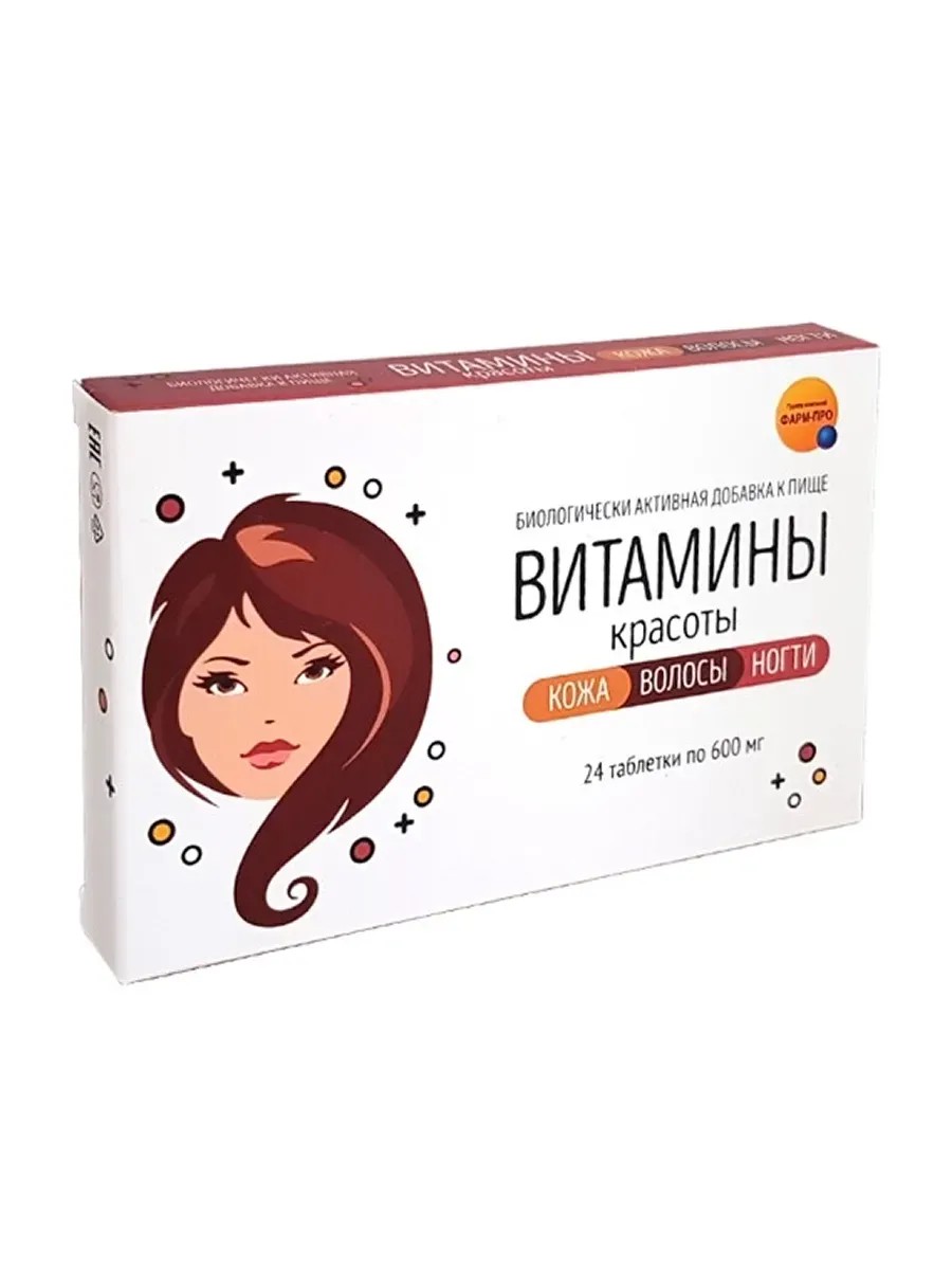 | Торговое наименование | биологически активная добавка к пище "Витамины красоты. Кожа, волосы, ногти." (таблетки массой 600 мг) |