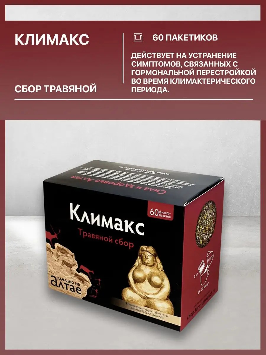 This herbal blend specifically addresses symptoms associated with hormonal changes during menopause. The herbs contained in the blend have estrogen-like and hormone-regulating effects, and provide calming, anti-inflammatory, antispasmodic, and restorative properties. Taking the blend improves mood and sleep, relieves hot flashes, reduces sweating, normalizes blood pressure and heart rate, and improves skin condition. The blend also contains a rich vitamin complex.