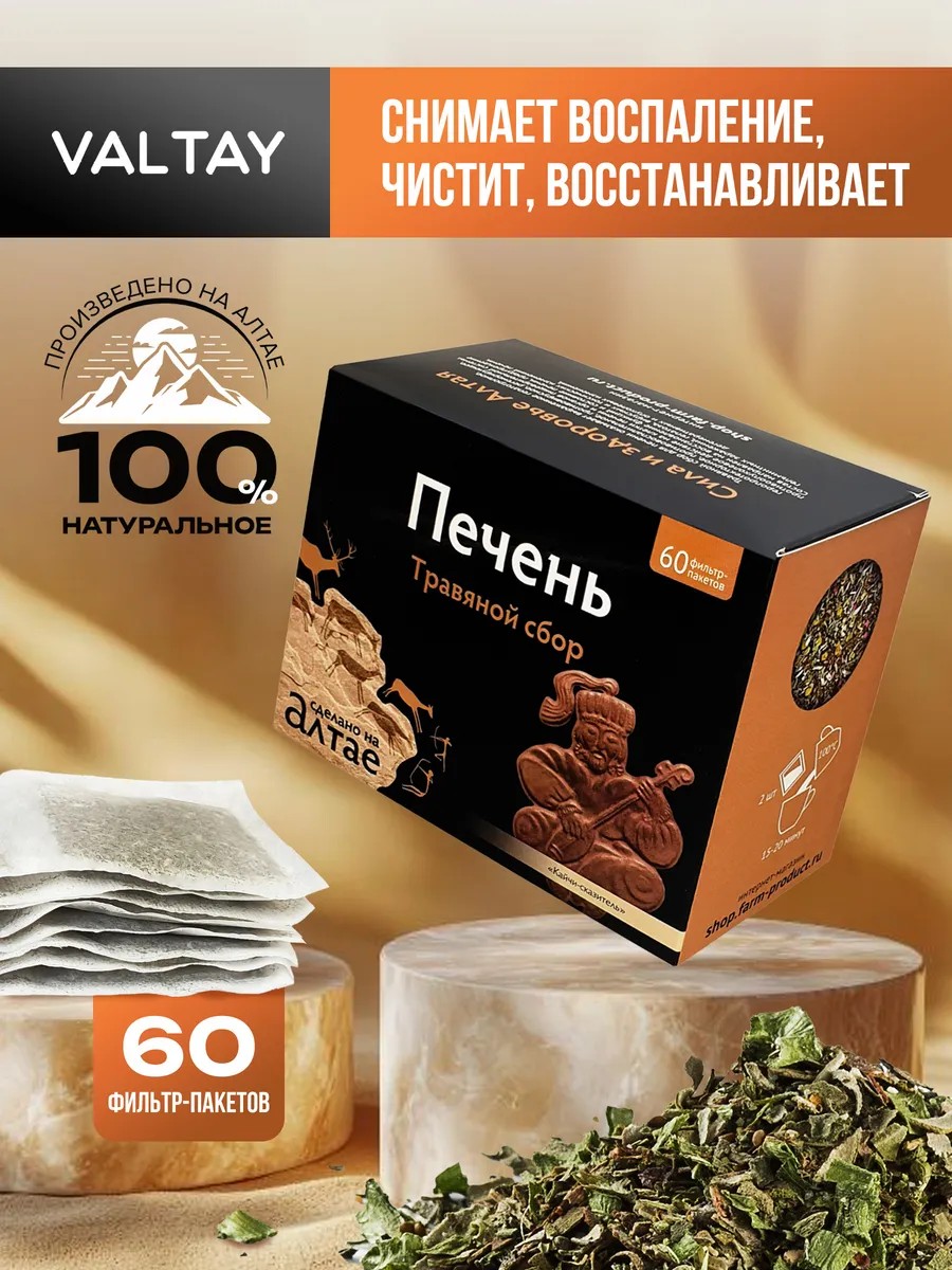 Травяной сбор "Печень" - это натуральный помощник для поддержания здоровья вашей печени. В состав сбора входят травы, известные своими полезными свойствами. Регулярное употребление чая из этого сбора может способствовать очищению и детоксикации печени, а также улучшению ее функциональности. Удобная упаковка с 60 фильтр-пакетами позволит вам наслаждаться ароматным и полезным напитком в любое время. - Очищает печень и желчные протоки