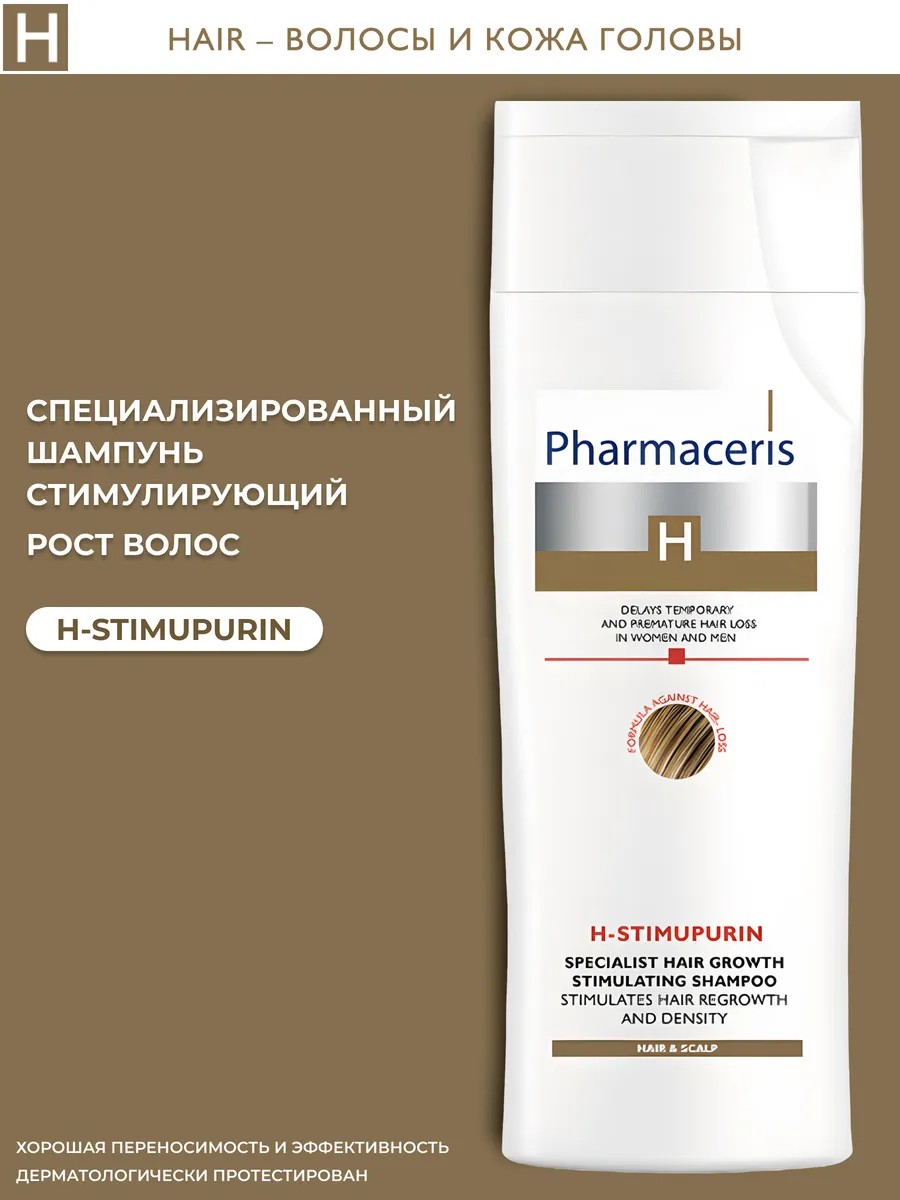 Для мужчин и женщин, страдающим от кратковременного или преждевременного, чрезмерного выпадения волос. Помогает предотвратить потерю волос, связанную с генетической наклонностью и гормональными (андрогенная алопеция) факторами или факторами внешней среды, а также ввиду длительного употребления медикаментов, стресса, усталости, общей слабости (например, из-за диеты) или после беременности. Можно использовать при чувствительной коже головы. Комбинация двух активных веществ – Естественный Фактор Роста FGF и кофеин демонстрируют научно доказанную эффективность предотвращения потери волос и одновременно стимулируют рост волос. Эти компоненты действуют на клеточном уровне, активизируя гены, ответственные за рост новых волос. Они укрепляют жизненные процессы фолликул волос, способствуя естественному росту волос и продлению жизненного цикла (фаза анагена). Кофеин предотвращает генетическую предрасположенность к облысению, нейтрализуя гормоны (андрогены, DHT), которые отвечают за ослабление и преждевременное выпадение волос. Тщательно подобранные компоненты – витамин PP (ниацин), Д-пантенол и биотин успокаивают и восстанавливают физиологический баланс кожи головы. Укрепляет структуру волос и восстанавливает естественный объем. НЕ СОДЕРЖИТ КОНСЕРВАНТОВ, АЛЛЕРГЕНОВ, КРАСИТЕЛЕЙ И СИЛИКОНА. Дермокосметика для различных проблем кожи. Марка Pharmaceris предлагает продукты дермокосметики, предназначенные для решения различных часто встречающихся проблем с кожей. Продукты марки создает команда экспертов, дополняющая дерматологические решения инновационными компонентами, таким образом получив формулу для трудно решаемых проблем кожи. СПОСОБ ПРИМЕНЕНИЯ: Мыть волосы шампунем ежедневно или как минимум 3 раза в неделю. Нанести шампунь на влажные волосы, вспенить в волосах, оставить на 2-3 минуты. Тщательно смыть водой. Если шампунь попадет в глаза, незамедлительно промыть их водой. Для получения лучшего результата также использовать бальзам Pharmaceris H-STIMULIN.