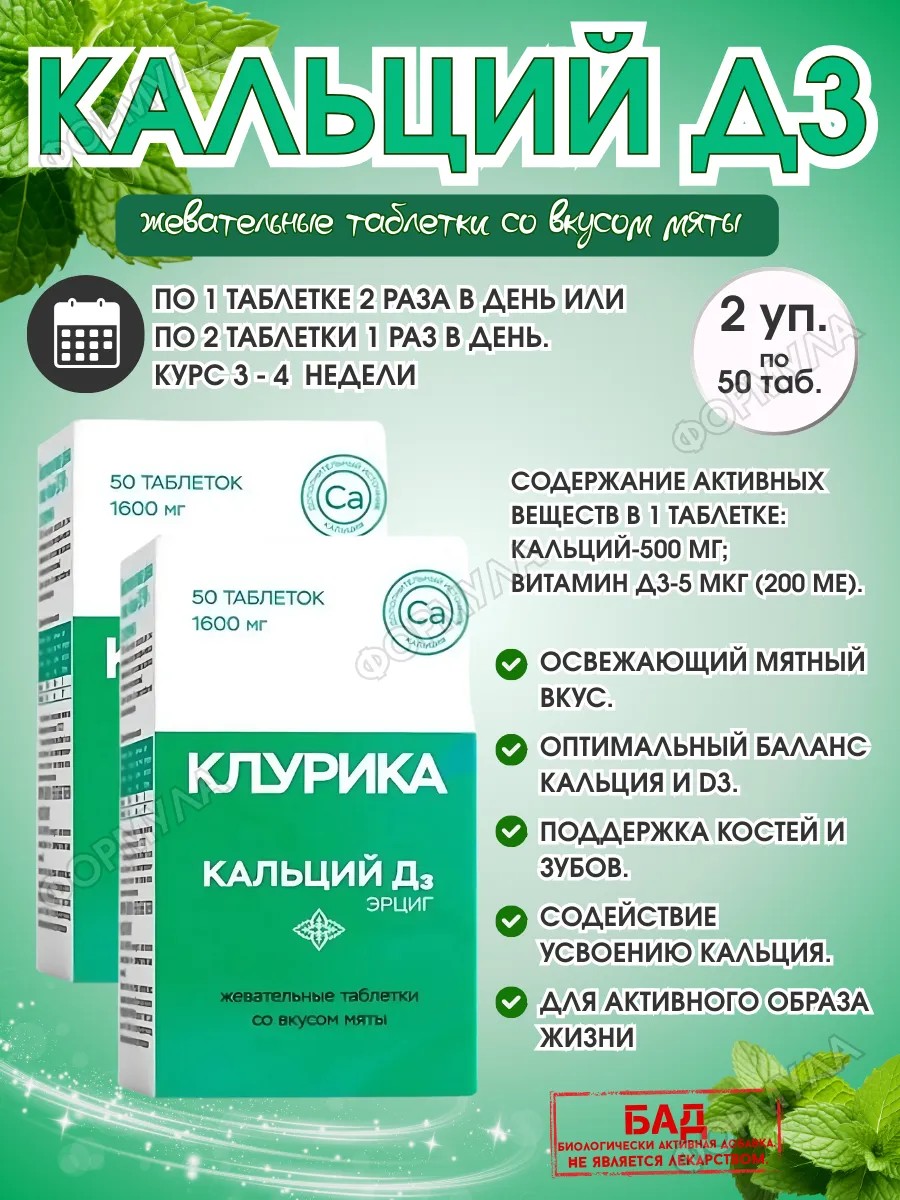 | Комплектация | Клурика Кальций-д3 Таб N50 Мята Бад; 2 уп |