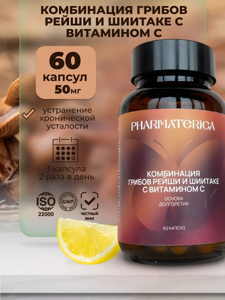 Комбинация грибов рейши и шиитаке с витамином C PHARMATERICA — ваш природный щит от болезней и ключ к активной жизни!