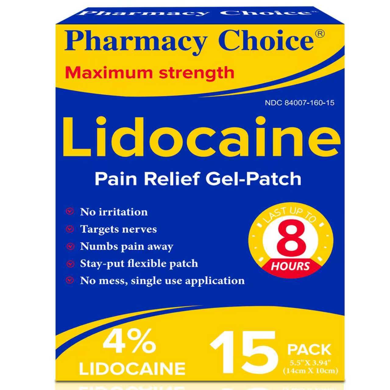 Pharmacy Choice 4 Lidocaine Pain Relief Gel Patches Maximum Strength Numbing Gel Patch for Back, Shoulder, Muscle, Joints, Knee Pain Relief ,15 countsWarm Tips : Before use, please read the instructions for use as well as the warnings and precautions carefully. They can be found on the back of the packing box and the individual packaging. If you have any questions, please feel free to contact us. No mess ,single use: Each piece is individually packaged, so you can use it with confidence. Each patch is individually wrapped for a hygienic and portable fit, perfect for travel or gym bags. Very easy to use . Fragrance-Free : Our 4 Lidocaine patches are unscented, The patches are made with a safe gel that adheres to clean, dry skin, leaving no residue and won't stain clothing. Flexible fit, not easy to fall off. No odor ensures that it can be used discreetly in any environment, without worrying about the strong odor affecting your life. Fast Acting and Long Lasting - Provide 8 hours long-lasting relief from muscle, joint,Whether recovering from a workout or experiencing daily back strain, it provides targeted relief. Great Value: 15 Pieces Individually vacuum-packaged patches per box. 3.94" x 5.51" (10 cm x 14 cm) specially sized lidocaine gel patches fit certain areas for all body parts such as Back ,neck arm ,leg , shoulders, knees, and elbow. Maximum Strength: 4 Lidocaine Gel Patches provide quickly , deep, and temporary relief for sore muscles in your back. neck , arm , leg,and hip, and joint in your knee, shoulder.