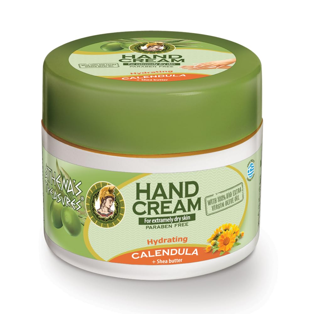 This rich hand cream from Athena's Treasures has been specially developed for extremely dry and sensitive skin. The formula combines valuable organic olive oil with soothing marigold and nourishing shea butter to intensively hydrate and regenerate the skin. Enriched with vitamins A and E and panthenol and glycerin, this cream protects your hands against the effects of cold, water and detergents. The paraben-free formula is quickly absorbed, without leaving a greasy film and gives your hands a pleasantly soft and supple feeling. The olive leaf extract also has a calming effect on irritated skin. With a 200 ml capacity, this hand cream provides long-lasting care for stressed hands. Ideal for daily use, to prevent dryness and maintain the skin's natural elasticity. SAFETY WARNING For external use onlyLarge capacity: 200 ml hand cream in a practical jar for long-term care and protection of rough, dry hands from cold and strain. Free from parabens, silicones, mineral oils and petrolatum - dermatologically tested formula suitable for sensitive skin. Fast Absorbing: The non-greasy formula is quickly absorbed without leaving a sticky film, ideal for daily use after washing hands or when in contact with cleaning agents. Natural ingredients: contains 100 organic extra virgin olive oil, olive leaf extract, calendula, vitamins A and E and panthenol to soothe the skin and protect it against external influences. Intensive moisture care: specially developed for extremely dry and sensitive hands, enriched with organic olive oil, marigold and shea butter for deep hydration and regeneration.Athena's Treasures Handcrème met calendula en sheaboter, hydraterend voor extreem droge huid, met biologische olijfolie, vrij van parabenen, 200 ml Deze rijke handcrème van Athena's Treasures is speciaal ontwikkeld voor extreem droge en gevoelige huid. De formule combineert waardevolle biologische olijfolie met rustgevende goudsbloem en voedende sheaboter om intensief te hydrateren en de huid te regenereren. Verrijkt met vitamine A en E en panthenol en glycerine, beschermt deze crème je handen tegen de effecten van kou, water en reinigingsmiddelen. De parabenvrije formule trekt snel in, zonder een vettige film achter te laten en geeft je handen een aangenaam zacht en soepel gevoel. Het olijfbladextract heeft bovendien een kalmerend effect op geïrriteerde huid. Met 200 ml inhoud biedt deze handcrème langdurige verzorging voor belaste handen. Ideaal voor dagelijks gebruik, om droogte te voorkomen en de natuurlijke elasticiteit van de huid te behouden. VEILIGHEIDSWAARSCHUWING Alleen voor uitwendig gebruikGrote inhoud: 200 ml handcrème in praktische pot voor langdurige verzorging en bescherming van ruwe, droge handen bij kou en belasting. Vrij van parabenen, siliconen, minerale oliën en vaseline – dermatologisch geteste formule geschikt voor de gevoelige huid. Snel intrekkend: de niet-vettige formule trekt snel in zonder kleverige film achter te laten, ideaal voor dagelijks gebruik na het handen wassen of bij contact met reinigingsmiddelen. Natuurlijke ingrediënten: bevat 100 biologische olijfolie extra vergine, olijfbladextract, calendula, vitamine A en E en panthenol om de huid te kalmeren en te beschermen tegen invloeden van buitenaf. Intensieve vochtverzorging: speciaal ontwikkeld voor extreem droge en gevoelige handen, verrijkt met biologische olijfolie, goudsbloem en sheaboter voor diepe hydratatie en regeneratie.