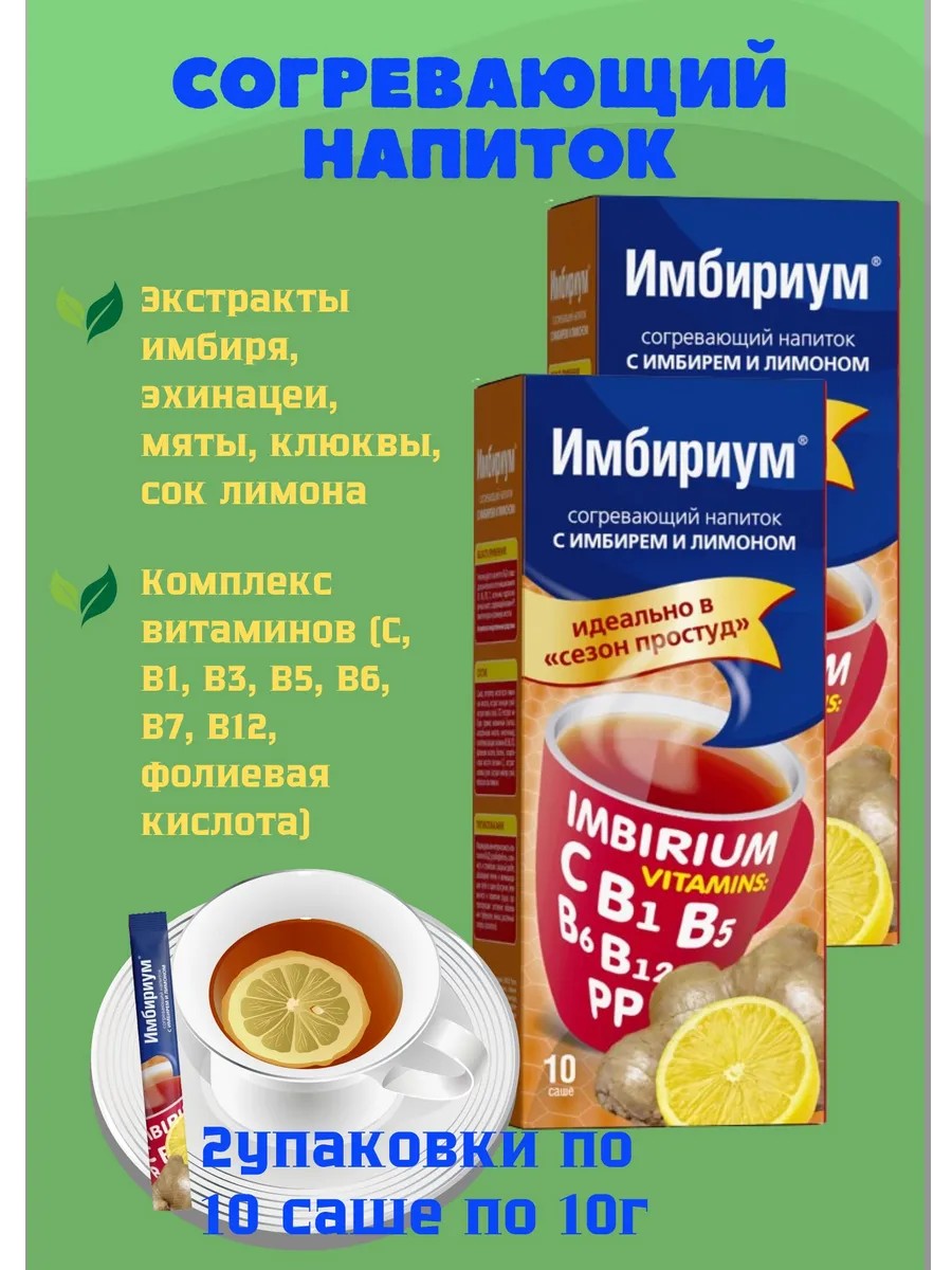 Имбириум согрев напиток с имбирем и лимоном - это биологически активная добавка (БАД) к пище. Горячий напиток «Имбириум» с имбирем и лимоном - один из эффективных методов профилактики и комплексного лечения симптомов простуды. Достаточно растворить порошок в горячей воде и напиток готов!Поможет в комплексной борьбе с симптомами орви и гриппа.