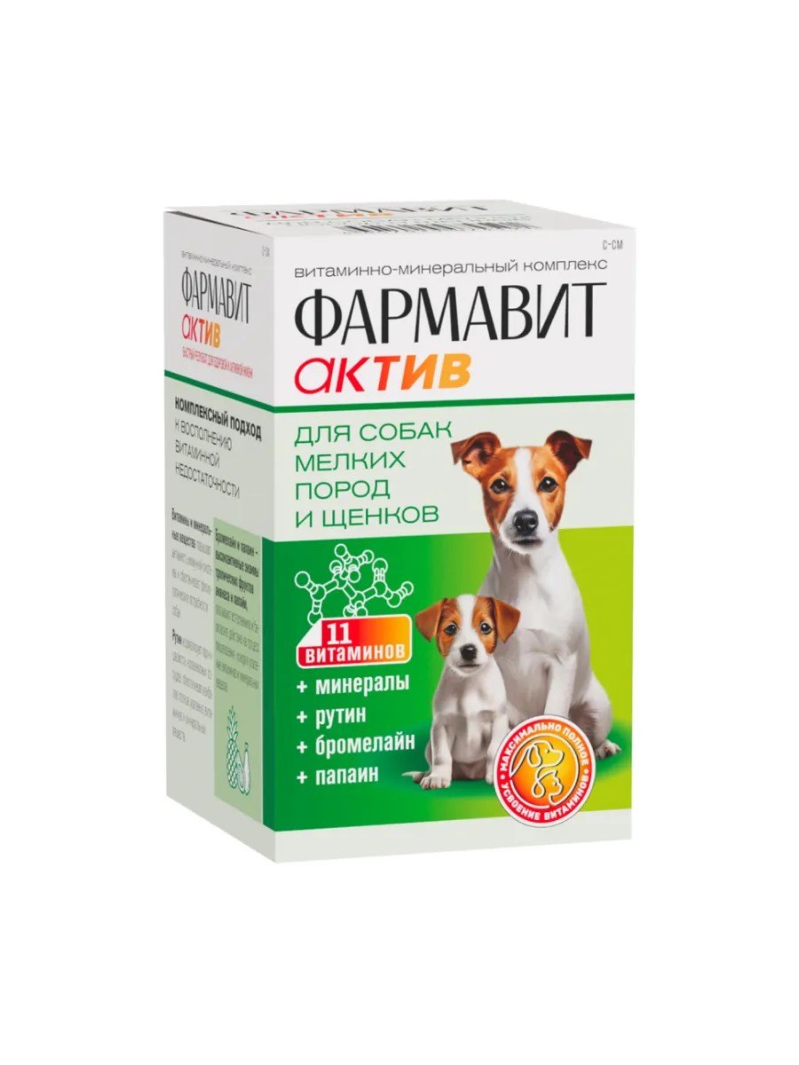 Farmavit Active is a vitamin and mineral complex with fruit enzymes, specially developed for small breed dogs and puppiesbr/br/Recommended for maintaining the balance of vitamins, amino acids, and minerals in the body and strengthening the immune system:br/br/*in case of unbalanced feedingbr/br/*during the period of active growth and development of puppiesbr/br/Farmavit Active for small breed dogs and puppies contains:ulli11 vitamins/liliBromelain and Papain - fruit enzymes for the most complete absorption of vitamins body/liliRutin for the prevention of allergic reactions/li/ulAdvantages of Farmavit Active:ulliInnovative composition. Fruit enzymes promote the most complete absorption of vitamins/liliClinically proven effectiveness. 100% pronounced preventive and therapeutic effectiveness/liliEase of use. Optimal packaging volume, convenient dosing and convenient packaging/liliRecommended once a day for 14-30 days at a dose of:br/br/puppies - 1 tabletbr/br/dogs 1-5 kg - 1-2 tabletsbr/br/dogs 5-10 kg - 2-3 tabletsbr/br/dogs 10-20 kg - 3-5 tabletsbr/br/dogs 20-30 kg - 5-7 tabletsbr/br/During pregnancy and lactation, recovery from illness increase dose 2 times./li/ul