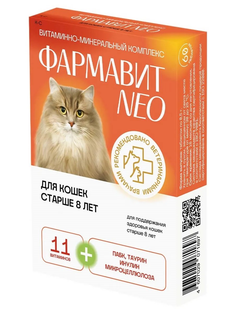 Фармавит Neo – комплекс витаминов, минералов и аминокислот, подобранных с учетом физиологических особенностей кошек старше 8 лет.
