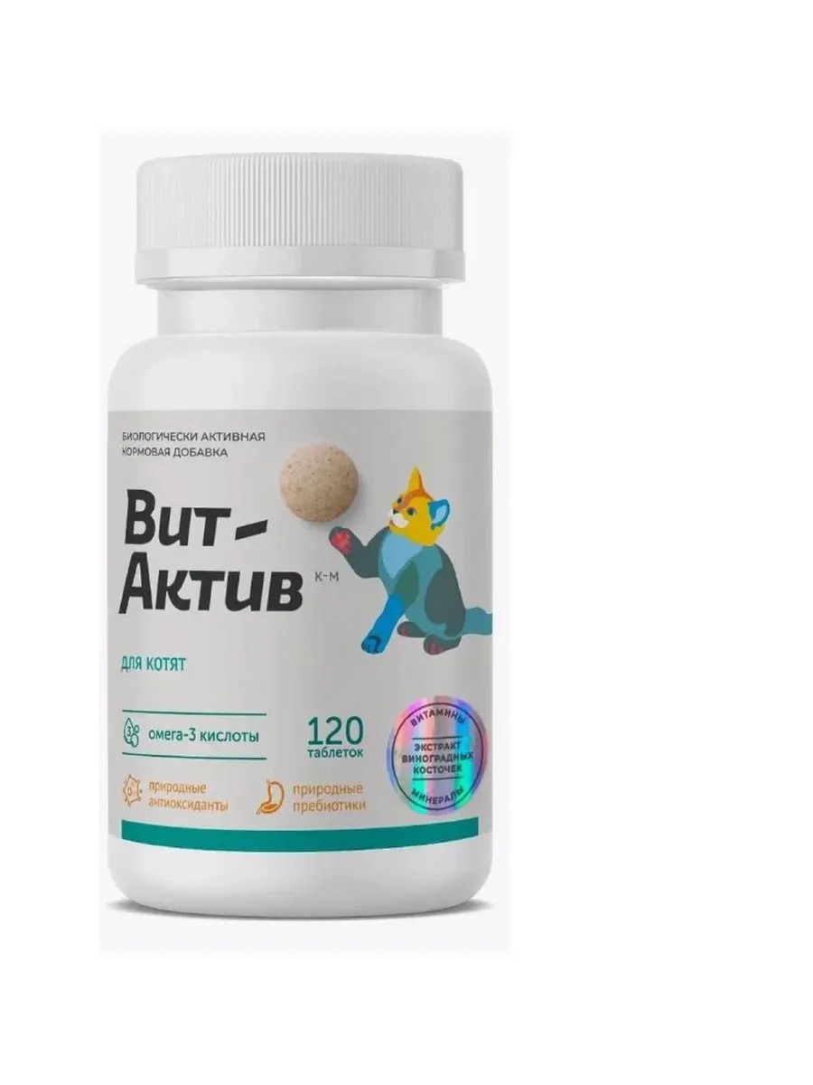 Vit-Active is a vitamin and mineral complex to provide kittens with the physiological needs for vitamins, amino acids and minerals, enriching the diet with natural antioxidants and prebiotics. Promotes active and healthy growth and development of kittens. Omega-3 acids contribute to the proper development of the brain and vision of kittens, strengthen the immune system, support growth and development Calcium and phosphorus the optimal ratio of calcium and phosphorus promotes their best absorption, provides structural strength of bones and teeth Natural antioxidants protect cell membranes from destruction, prevent many diseases, accelerate the recovery process Natural prebiotics normalize the digestion process, increase the absorption of vitamins, microelements and antioxidants Package: 120 tablets Composition: fat-soluble vitamins: A, D3, E; water-soluble vitamins: B1, B2, B3, B6, B12; amino acids: taurine; minerals: calcium, phosphorus; Biologically active ingredients: grape seed extract (natural antioxidant), Jerusalem artichoke powder (natural prebiotic), fish oil (Omega-3 acids); Tablet base: brewer's yeast