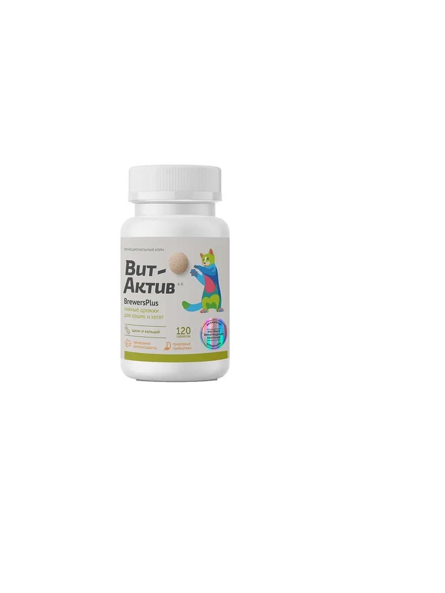 Вит-Актив – витаминно-минеральный комплекс для улучшения состояния кожно-шерстного покрова, обеспечения физиологических потребностей кошек в витаминах, аминокислотах и минеральных веществах, обогащения рациона природными антиоксидантами и пребиотиками. Способствует активному и здоровому образу жизни кошек. Состав: Пивные дрожжи инактивированные, Лактат кальция, Хелат цинка, Экстракт виноградных косточек (природные антиоксиданты), Порошок топинамбура (природные пребиотики) Пивные дрожжи повышают активность иммунной системы, стимулируют рост новых здоровых волос, восстанавливают эластичность кожи Кальций и цинк нормализуют работу кожных желез, восстанавливают естественный окрас шерсти и способствуют правильному формированию волос и подшерстка Природные антиоксиданты защищают клеточные мембраны от разрушения, предотвращают многие заболевания, ускоряют процесс выздоровления, снижают риск аллергических реакций на коже Природные пребиотики нормализуют процесс пищеварения, повышают усвоение витаминов, микроэлементов и антиоксидантов Способ применения: Рекомендуется один раз в сутки в течение всего года - для котят и кошек менее 4 кг - 1 таблетка - для кошек более 4 кг – 2 таблетки Вит-Актив совместим со всеми ингредиентами кормов и лекарственными препаратами. Фасовка: 120 таблеток по 0,5 г