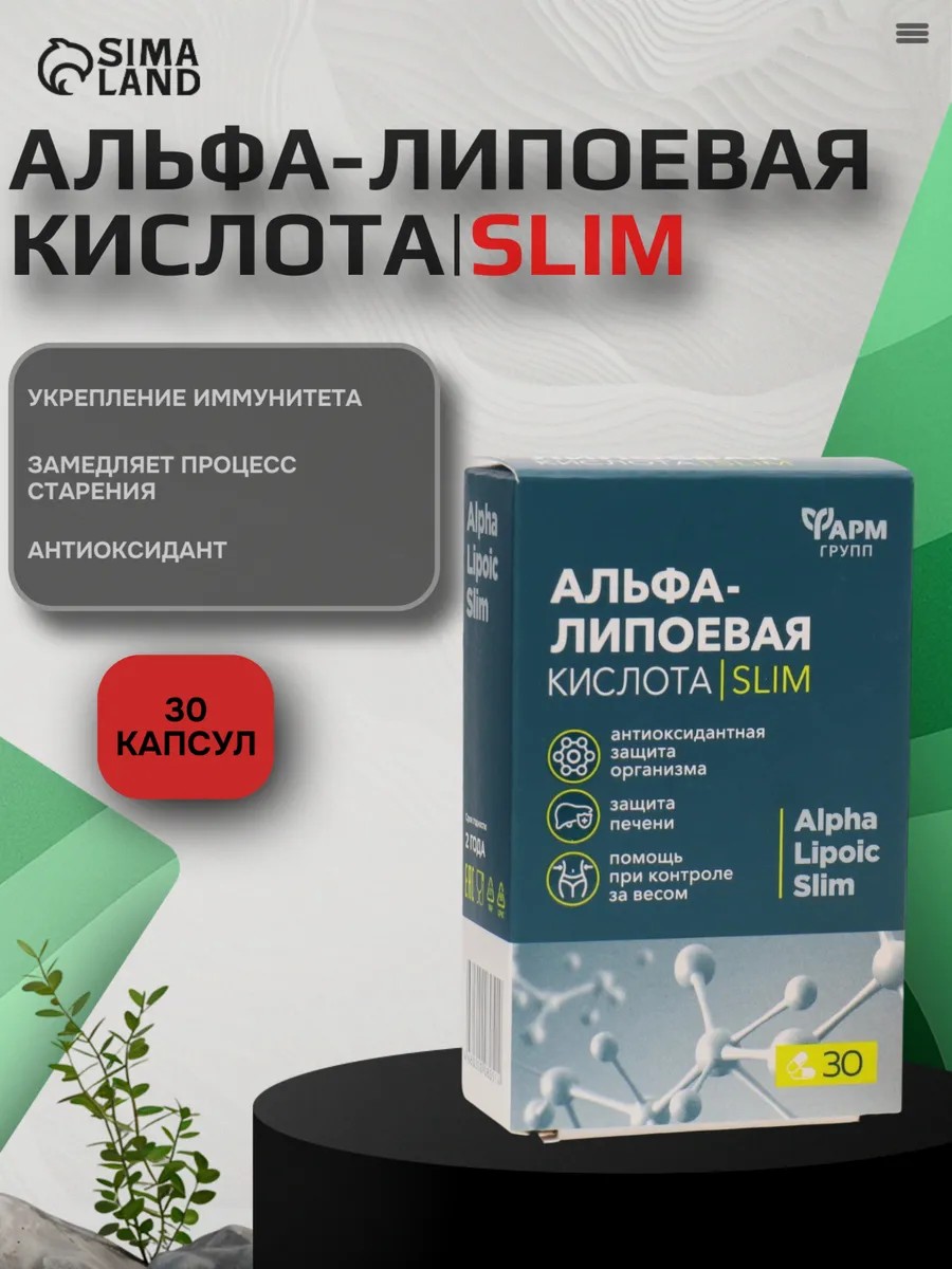 | Торговое наименование | биологически активная добавка к пище "Альфа-липоевая кислота Слим (Alpha Lipoic Slim)" (таблетки массой 500 мг, капсулы массой 400 мг) |
