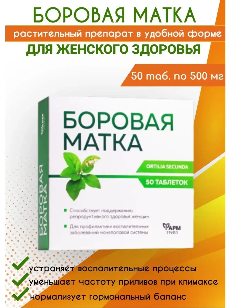 Боровая матка 500 мг Фармгрупп применяется как мочегонное и антисептическое средство при воспалительных заболеваниях мочевыводящей системы, оказывает противомикробное, спазмолитическое действие, способствует укреплению иммунитета. Средство рекомендуется для профилактики заболеваний мочеполовой сферы, чистки желудка и кишечника. Боровая матка – лекарственное растение, которое используется для лечения широкого спектра гинекологических заболеваний и выступает эффективным средством борьбы с женским и мужским бесплодием. Боровая матка эффективна при воспалении яичников, спаечных процессах , эндометриозе, эрозии шейки матки, поликистозе яичников. Нормализует гормональный баланс женского организма, регулирует менструальный цикл, помогает при мастопатии, фиброме, миоме, улучшает функционирование репродуктивной системы организма. Оказывает положительное действие при климактерических симптомах, уменьшает частоту приливов, улучшает общее состояние. Дозировка: флавоноиды - 12 мг. (6 таб.) Нерастворимые пищевые волокна - 2,1 г. (6 таб.) Арбутин - 4,2 мг. (6 таб.). СПОСОБ ПРИМЕНЕНИЯ: взрослым по 2 таблетки 3 раза в день во время еды, запивая большим количеством воды. Продолжительность приема - 1 месяц. ПОКАЗАНИЯ: рекомендуется в качестве источника флавоноидов, арбутина, содержащего пищевые волокна. Перед применением проконсультируйтесь с врачом. Внешний вид товара может отличаться от изображения.