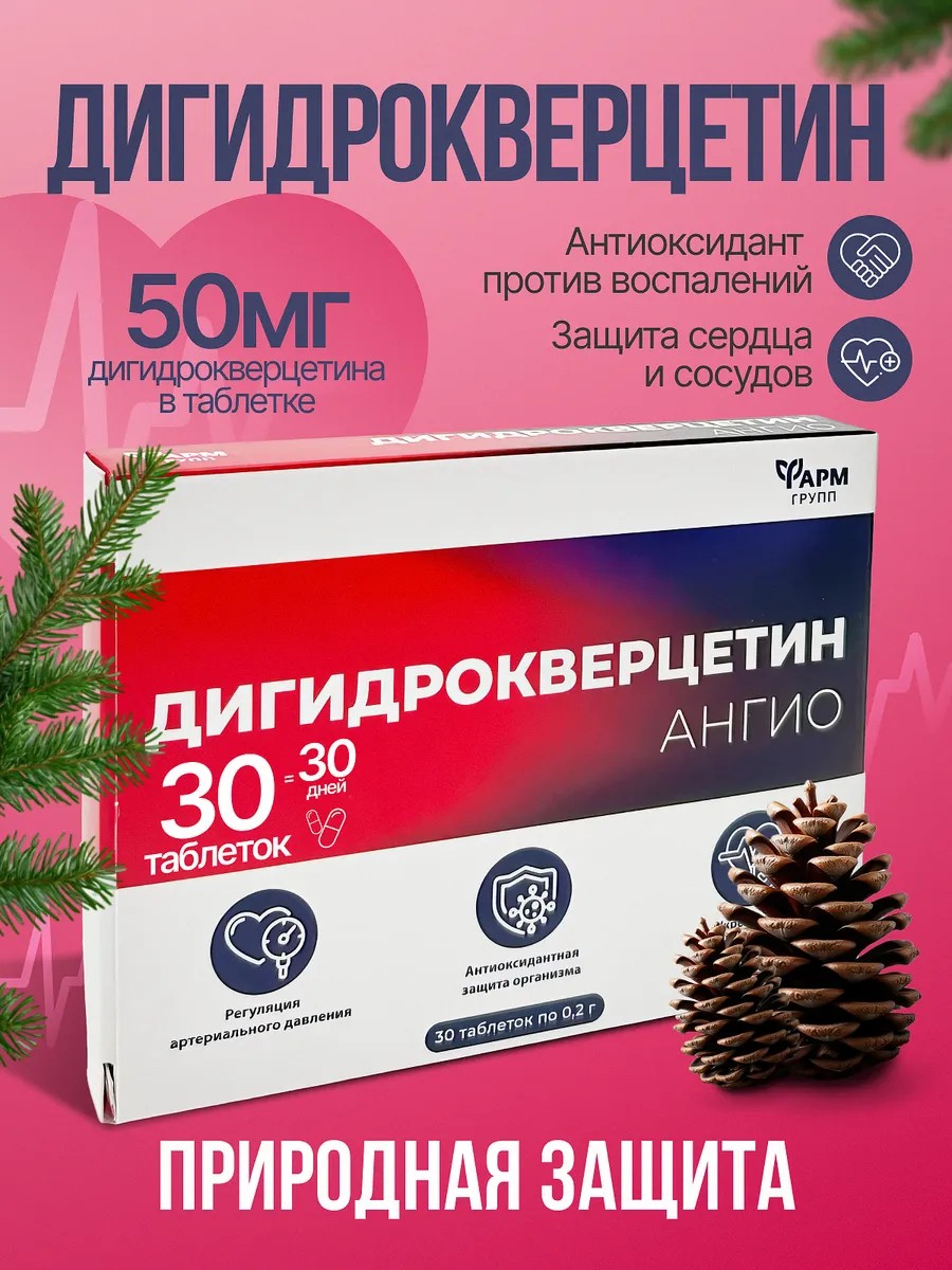 Ingredients: microcrystalline cellulose, dihydroquercetin, calcium stearate, talc. Adults take 1 tablet once daily with food. Recommended duration: 1 month. Consult a physician before use. Dihydroquercetin: antioxidant protection, free radical scavenging, inflammation reduction, immune system enhancement, increased energy, improved cognitive function, heart health, cardiovascular disease prevention, vascular strengthening, cholesterol reduction, reduced risk of blood clots, normalized blood pressure, improved joint health, lung health.
