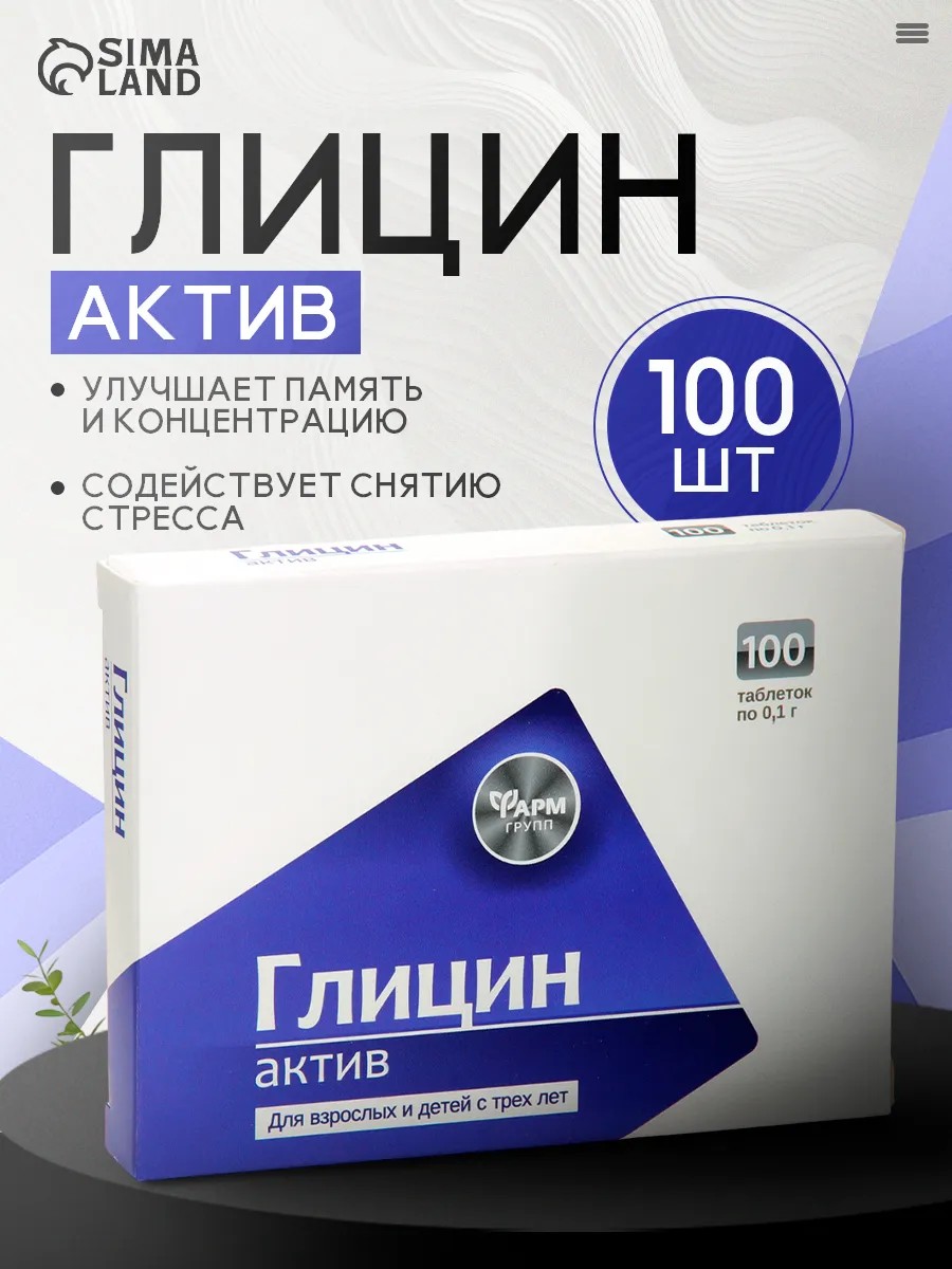 Глицин -актив - это биологически активная добавка к пище, которая содержит аминокислоту глицин. Глицин играет важную роль в организме человека, участвуя в процессах обмена веществ, восстановлении нервной системы и улучшении общего состояния организма. Таблетки Глицин -актив имеют удобную форму и легко проглатываются. В упаковке содержится 100 таблеток по 0,1 г каждая. Глицин -актив не является лекарственным средством и не может заменить полноценное питание. Перед применением необходимо проконсультироваться с врачом.