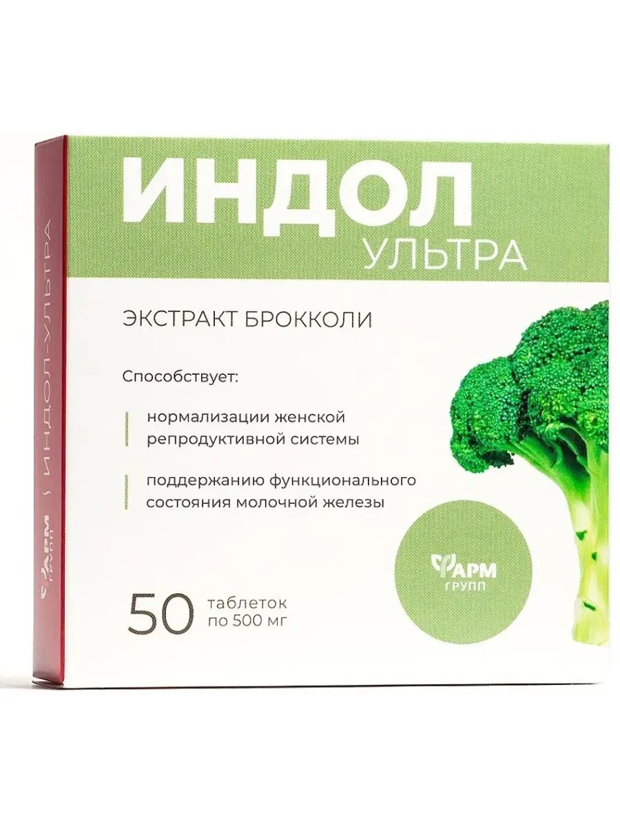 Indole Ultra helps normalize the female reproductive system and maintain a balance of female hormones. Broccoli extract reduces the risk of breast pathologies. Prevents the formation of seals in the mammary glands. Ingredients: microcrystalline cellulose (carrier), broccoli extract (indole-3-carbinol), starch (stabilizer), calcium stearate (anti-caking agent). Indole-3-carbinol in 1 tablet - 85 mg. Directions: Adults take 1 tablet daily with meals. Duration of treatment: 1 month. Not a medicine.