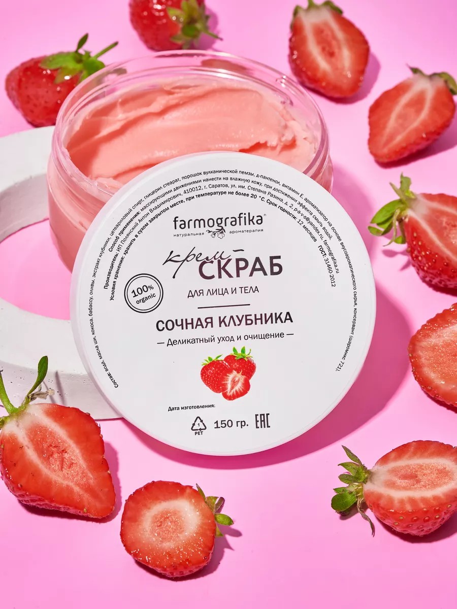 КРЕМ-СКРАБ "Клубника" имеет легкую и нежную кремообразную текстуру (есть на фото) , что позволяет тщательно удалить поверхностные загрязнения, ороговевшие клетки эпидермиса.