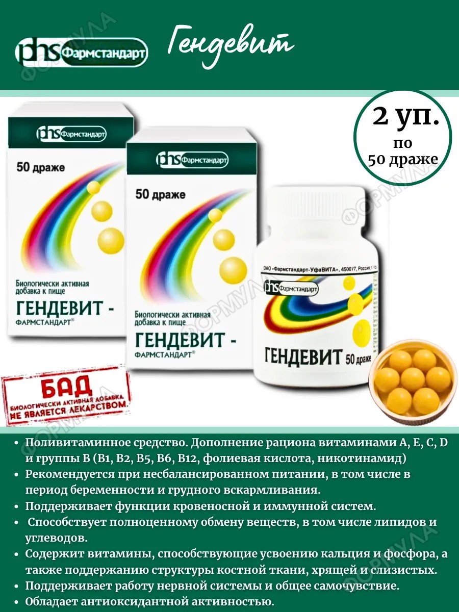 | Полное наименование товара | Гендевит-фармстандарт 50 шт. драже массой 1000 мг |