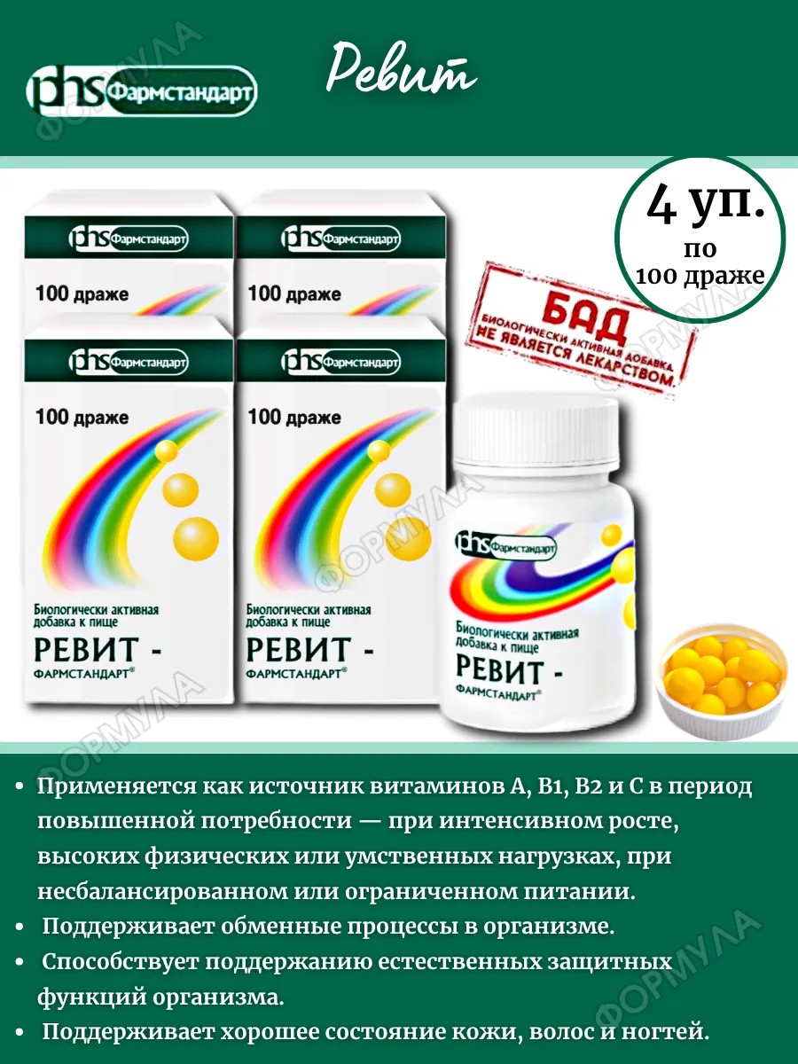 | Комплектация | Pевит-фармстандарт n100 драже по 0,5г*4шт |