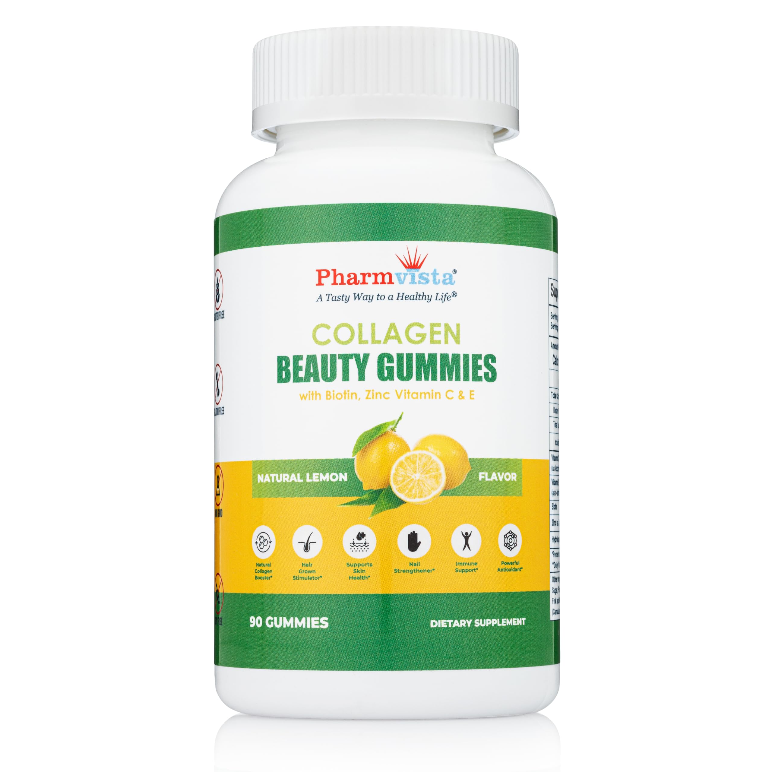 Enjoy Pharmvista's tasty and affordable collagen hair skin nails gummies in a 90 count pack size. Our gummy product has the following characteristics: 1. Delicious Convenient: Enjoy the yummiest way to boost your beauty routine with our tasty, easy-to-take collagen gummies, making wellness enjoyable every day. 2. Collagen Benefits: Our collagen-rich formula, is designed to support a healthy skin . 3. Boosts Collagen Production: Supports your body's natural collagen production, aiding in joint support and overall mobility, keeping you active and vibrant . 4. Essential Nutrients: Infused with essential vitamins and minerals like biotin, zinc, and vitamins C E to nourish your body from within, supporting various bodily functions . 5. GMP Certified Facility: Manufactured in a GMP-certified facility, with NSF, BRCGS, ISO certifications, adhering to strict quality controls to ensure you receive the best product possible. 6. Natural Flavors Colors: Made with natural flavors and colors, our gummies are free from artificial additives, making them a healthier choice for your daily routine. 7. Satisfaction Guaranteed: We stand by our product with confidence. If you're not completely satisfied, we offer a money-back guarantee for your peace of mind.Every lot is 3rd party lab tested to ensure high standards of quality, safety, and purity in every bottle. Gluten-Free gummy product made with non-GMO ingredients. Radiant Hair, Skin Nails: Formulated to enhance your natural beauty by promoting strong, shiny hair, glowing skin, and resilient nails with consistent use . US Made : Proudly manufactured in the USA in a NSF GMP facility with ISO, BRCGS and HACCP quality certifications. Premium Quality Ingredients: Each gummy serving is packed with 200mg of hydrolyzed collagen, 2500mcg of biotin, 5mg of zinc, and vitamins C E, carefully selected to support your overall health. .