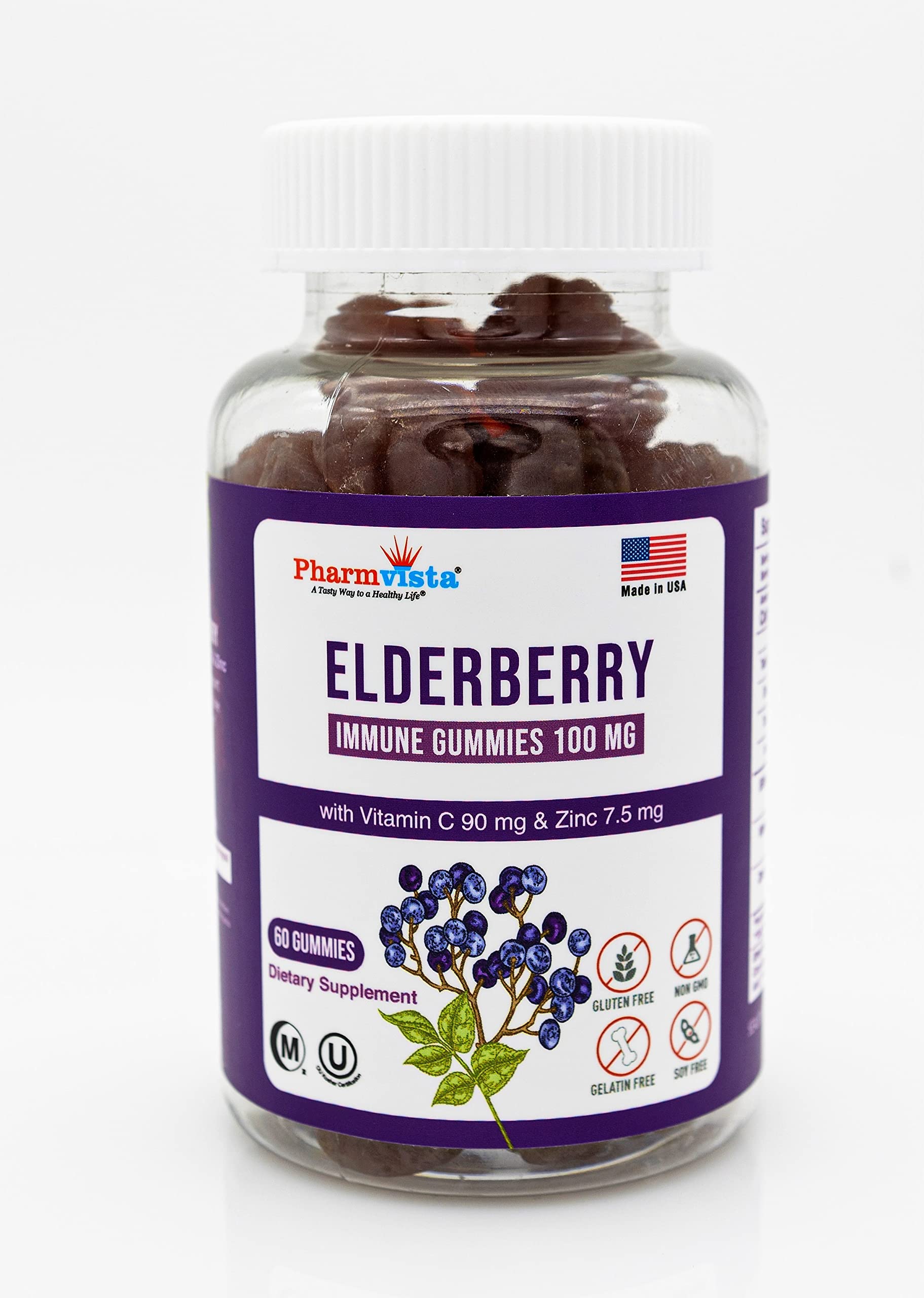 Gluten Free, Soy Free, Dairy Free and Gelatin free. Made with Non-GMO ingredients. Kosher and Halal certified product. All Natural Color and Flavor. Rich in Zinc and Vitamin C for immune support. Vegan and Vegetarian Friendly Snack. Manufactured in USA in a cGMP certified Facility . Boost your Immune Health . The Organic Elderberry is standardized to contain 7 anthocyanin for higher potency. Elderberry Gummies 100mg with Vitamin C 90mg Zinc 7.5mg - Helps to support Healthy Immune Function .