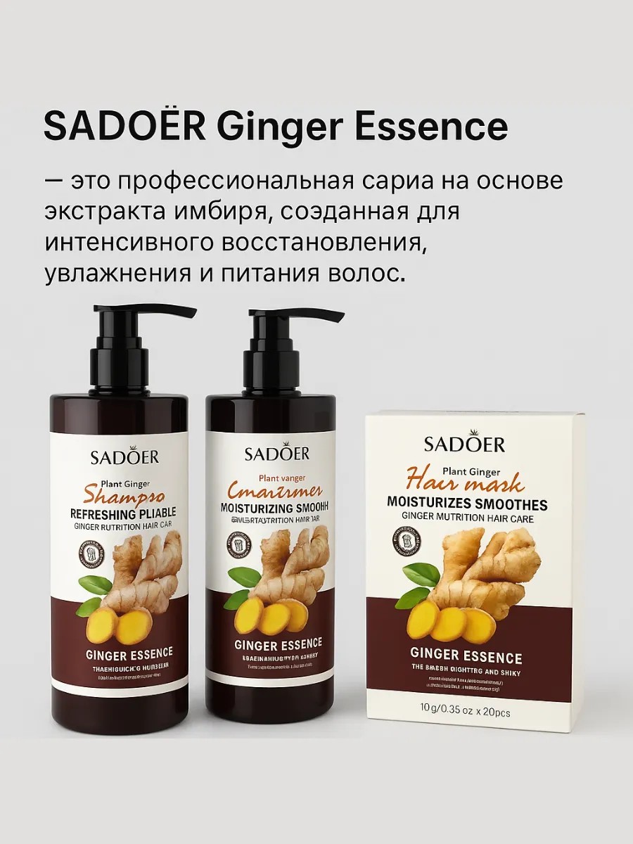 The SADOER Ginger Essence hair care set is a professional series based on ginger extract, designed for intensive restoration, hydration, and nourishment of hair.