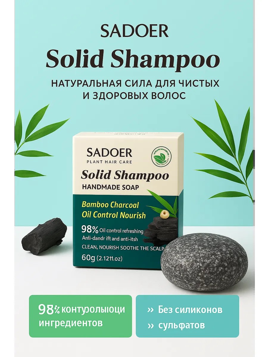 Твёрдый шампунь SADOER с бамбуковым углём – это современное средство для ухода за волосами и кожей головы, созданное на основе натуральных растительных компонентов. Он эффективно очищает, регулирует работу сальных желез, снимает зуд и препятствует появлению перхоти.