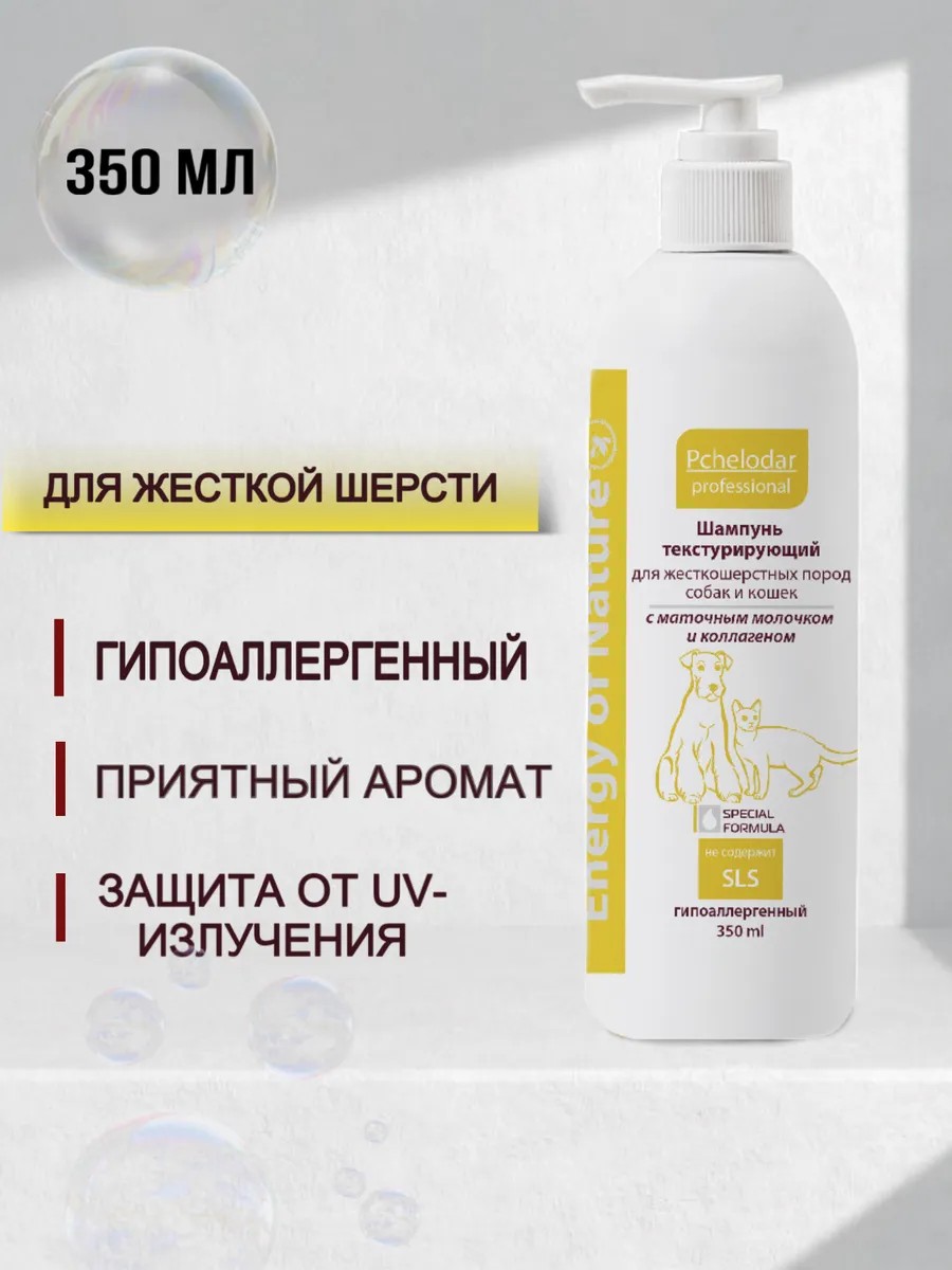 Пчелодар- специально разработанное средство для глубокого очищения жесткой шерсти животного, а также для усиления естественной яркости окраса. Натуральные компоненты, входящие в состав шампуня, обеспечивают бережный уход и питание кожи и шерсти животного. Коллаген восстанавливает первоначальную форму жестких волос и сохраняет их текстуру. Шампунь заботливо защищает кожно-шерстный покров животного от UV–излучения и других неблагоприятных воздействий окружающей среды, препятствует проникновению грязи, отталкивает пыль. Снимает статическое напряжение шерсти и дарит приятный свежий аромат.
