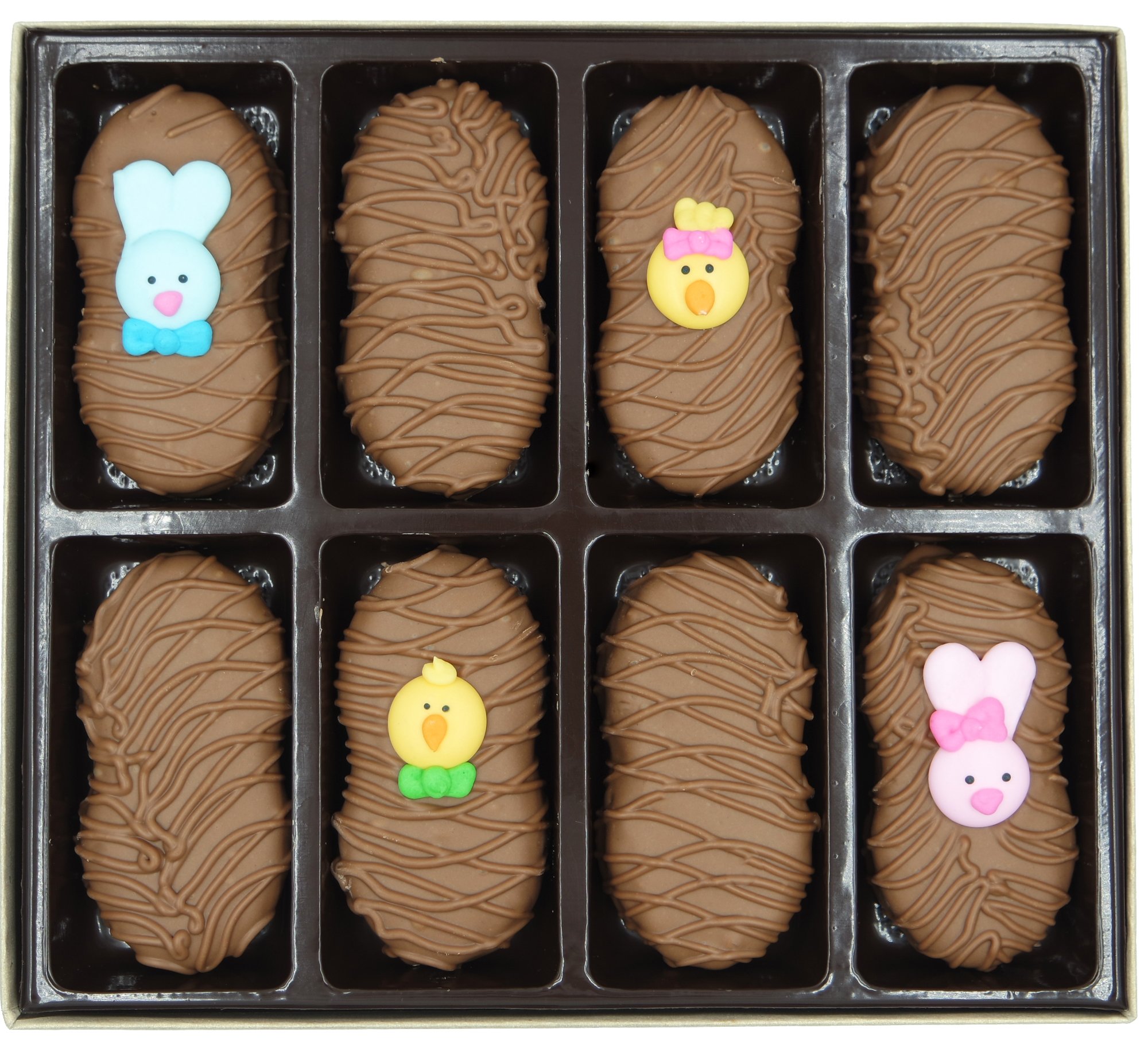Philadelphia Candies has been manufacturing fine chocolates in Hermitage, Pennsylvania for over 100 years. The company was founded in 1919 and operates retail stores in Pennsylvania and Ohio. Personalized gift message and gift wrap available. Philadelphia Candies offers 100% happiness on all chocolates. Made with Nutter Butter cookies covered in Philadelphia Candies milk chocolate. Nutter Butter is a registered trademark of Mondelez International. Each gift box contains 8 cookies: 4 decorated cookies with a variety of Easter figures (Blue Easter Rabbit, Pink Easter Rabbit, Male Chick, Female Chick) and 4 undecorated cookies for the highest visual appeal. Royal icing (sugar) decorations are Made in the USA. These Easter theme peanut butter sandwich cookies make a perfect gift or table setting!.