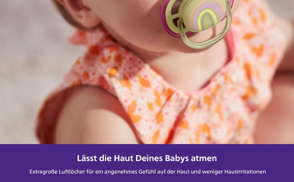 The Philips Avent Ultra Air Schnuller is a breathable pacifier for babies aged 0–6 months.It has extra -wheeled air holes, which means that your baby's skin can breathe and stay dry.The jaw-friendly and BPA-free pacifier set has a transport box that also serves as a sterilizer for the microwave.This only requires a little water, which is placed in the box together with the nullters to sterilize it in the microwave.We asked mothers how their children react to our structured silicone vacuum cleaners.98 agreed that their baby accepted the Philips Avent Ultra Soft and Ultra Air Schnuller.All components of the Ultra Air Schnuller are light and designed for a pleasant skin feeling, including the pleasantly soft vacuum cleaner for a natural suction feeling.In the development of the pacifier, Philips Avent deliberately pays attention to healthy and jaw -friendly tooth development of babies.The symmetrical vacuum cleaner respects the natural shape of palate, teeth and gums and enables the baby's natural lip closure. Consumer tests in the USA from 2016 to 2017 show an average acceptance of the structured Philips Avent Saugers of 98 , which is used for our Ultra Air and Ultra Soft Schnuller. For hygienic reasons, the pacifiers should be replaced every 4 weeks.calming feeling for your baby: natural, pleasant feeling for your baby with our structured silicone vacuum cleaner, which imitates the feeling of a breast.Natural dental development: Our jaw -friendly, symmetrical and soft silicone vacuum cleaners are designed for natural dental development.Sucker 100 of silicone: Our Philips Avent Ultra Soft and Ultra Air vacuum cleaner are 100 of food -compatible silicone.They are free of dangerous chemicals and substances such as BPA and allergens.98 of the babies accept the vacuum cleaner : We asked mothers how their children react to our structured silicone vacuum cleaners.98 stated that her baby accepted the Philips Avent Ultra Air Schnuller.Breathable, BPA-free pacifier with particularly large air holes that let your baby's skin breathe and cause a dry and calming feeling.Der Philips Avent ultra air Schnuller ist ein atmungsaktiver Schnuller für Babys im Alter von 0–6 Monaten. Er verfügt über extragroße Luftlöcher, wodurch die Haut Deines Babys atmen kann und trocken bleibt. Das kiefergerecht geformte und BPA-freie Schnuller-Set verfügt über eine Transportbox, die gleichzeitig als Sterilisator für die Mikrowelle dient. Hierzu bedarf es lediglich etwas Wasser, welches zusammen mit den Schnullern in die Box gegeben wird, um es in der Mikrowelle zu sterilisieren. Wir haben Mütter gefragt, wie ihre Kinder auf unsere strukturierten Silikonsauger reagieren. 98 gaben an, dass ihr Baby die Philips Avent ultra soft und ultra air Schnuller akzeptiert. Alle Komponenten des ultra air Schnullers sind leicht und für ein angenehmes Hautgefühl konzipiert, darunter auch der angenehm weiche Sauger für ein natürliches Sauggefühl. Philips Avent achtet bei der Entwicklung des Schnullers bewusst auf eine gesunde und kiefergerechte Zahnentwicklung von Babys. Der symmetrische Sauger respektiert die natürliche Form von Gaumen, Zähnen und Zahnfleisch und ermöglicht einen natürlichen Lippenschluss des Babys. Verbrauchertests in den USA von 2016 bis 2017 zeigen eine durchschnittliche Annahme des strukturierten Philips Avent Saugers von 98 , der für unsere ultra air und ultra soft Schnuller verwendet wird. Aus hygienischen Gründen sollten die Schnuller alle 4 Wochen ausgetauscht werden.Beruhigendes Sauggefühl für Dein Baby: Natürliches, angenehmes Gefühl für Dein Baby mit unserem strukturierten Sauger aus Silikon, der das Gefühl einer Brust nachahmt. Natürliche Dentalentwicklung: Unsere kiefergerechten, symmetrischen und weichen Sauger aus Silikon sind für eine natürliche Dentalentwicklung ausgelegt. Sauger zu 100 aus Silikon: Unsere Philips Avent ultra soft und ultra air Sauger bestehen zu 100 aus lebensmitteltauglichem Silikon. Sie sind frei von gefährlichen Chemikalien und Substanzen wie BPA und Allergenen. 98 der Babys akzeptieren den Sauger : Wir haben Mütter gefragt, wie ihre Kinder auf unsere strukturierten Silikonsauger reagieren. 98 gaben an, dass ihr Baby die Philips Avent ultra air Schnuller akzeptiert. Atmungsaktiver, BPA-freier Schnuller mit besonders großen Luftlöchern, die die Haut Deines Babys atmen lassen und dabei für ein trockenes und beruhigendes Gefühl sorgen.Philips Avent ultra air Schnuller - 2er Pack, BPA-freier, atmungsaktiver Schnuller für Babys von 0-6 Monaten, inklusive Transport- und Sterilisationsbox, lila grün (Modell SCF085 59) 2er-Pack lila grün