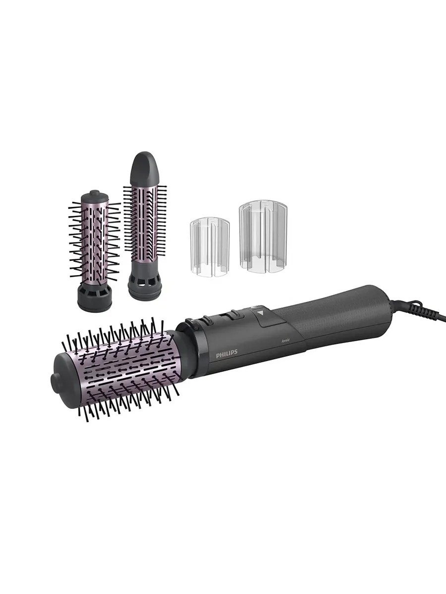 В комплекте с феном-щеткой идут три насадки, которые позволяют создавать разнообразные укладки и делать волосы гладкими и блестящими.