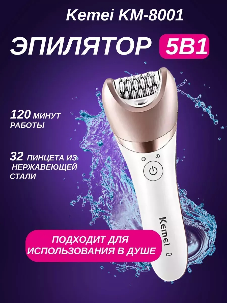 A power adapter is included for recharging the battery. A brush for cleaning the attachments is also included. The epilator has two operating modes and a backlight, allowing you to adjust the speed of rotation of the heads, thereby reducing pain. The model features an ergonomic body, smooth contours, and a special anti-slip surface. The KM-8001 5-in-1 hair clipper will provide you with comfortable and painless skin care for daily use! Features: - This is a multifunctional device with 1 epilation head, 1 shaving head, 1 facial cleansing brush, 1 massage head, and 1 callus removal head.