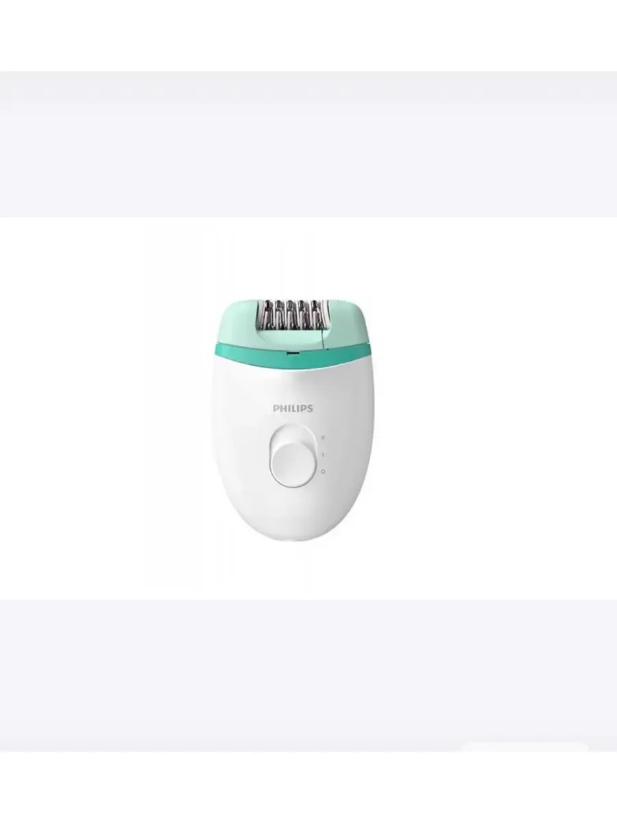 The Philips BRE224/00 epilator operates on a 220V power supply. Its white plastic body with mint-colored accents is made of plastic. A slide switch operates one of two operating modes. This model is designed to remove hair as short as 0.5 mm from any part of the body thanks to its replaceable attachment. It is equipped with 21 single-rotating discs and 20 tweezers. The attachment is washable under running water. A cleaning brush is included. The epilator's dimensions are 14 x 11.5 x 5.5 cm and weighs 162 g.